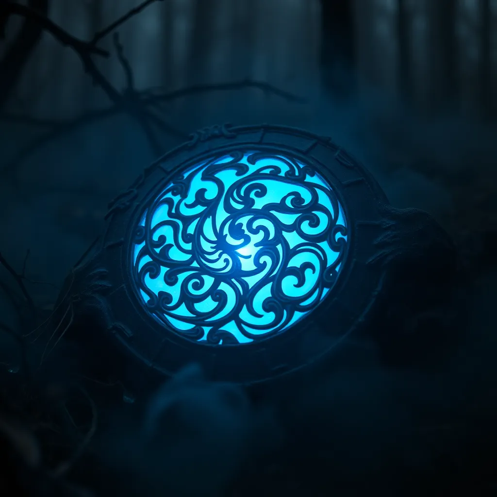 Create an extreme close-up of a mysterious, glowing artifact buried in the heart of a dense, foggy forest. Focus on the intricate, swirling patterns etched into its surface, illuminated by an otherworldly blue light. The surrounding environment is shrouded in mist, with tendrils of fog curling around the artifact.
