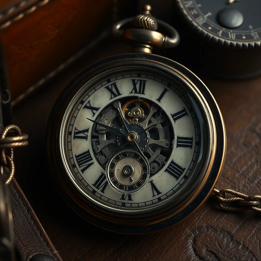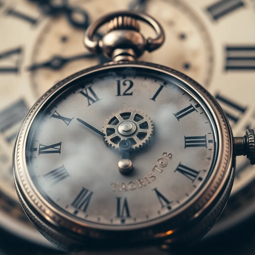 Create an extreme close-up of a vintage pocket watch, focusing on the intricate engravings and mechanisms. The watch's face is foggy with mist, and a single, delicate gear is visible in the center. The background is a blurred, ornate clock face. The image should evoke a sense of nostalgia and wonder.