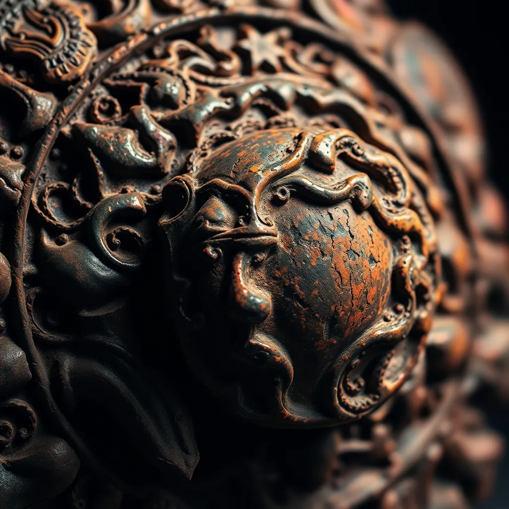 Capture the intricate details of a mysterious, ancient artifact. Focus on the intricate carvings, worn textures, and subtle patina on the surface. Imagine the artifact has been hidden for centuries, and the camera is the first to reveal its secrets. Generate an extreme close-up that makes the viewer feel like they're touching the artifact.