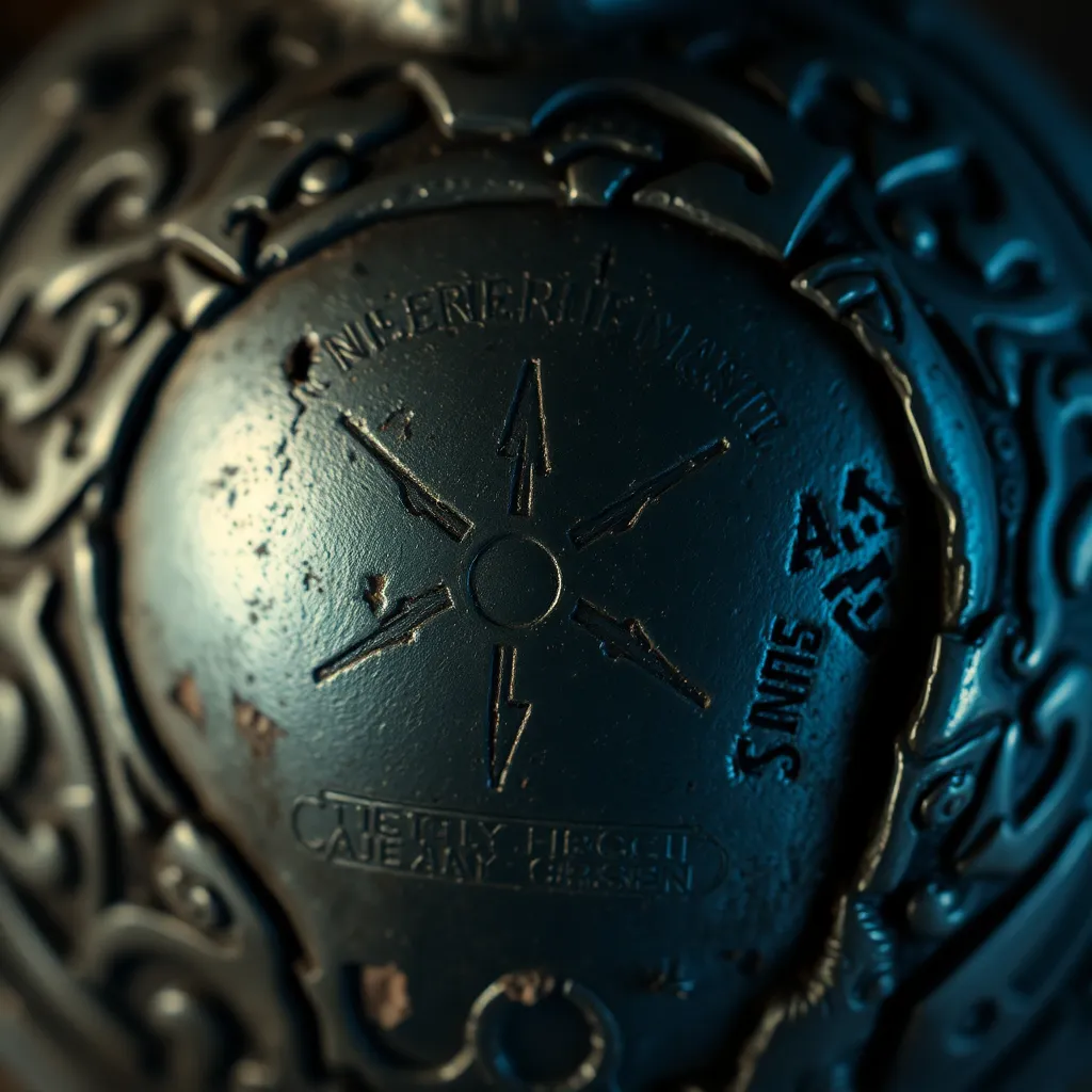 Capture the intricate details of a mysterious, ancient artifact. The object's surface is worn and weathered, with intricate carvings and symbols etched into its metal body. The extreme close-up reveals the subtle texture of the metal, the intricate patterns, and the faint glow of an unknown energy source.