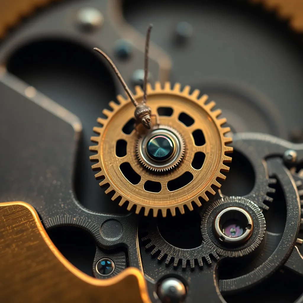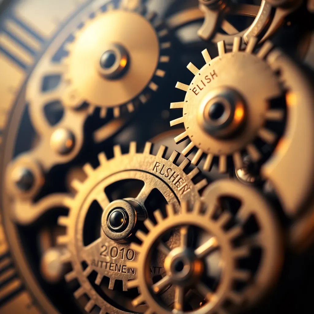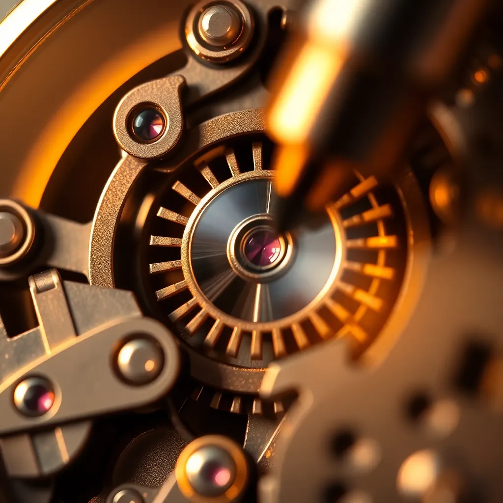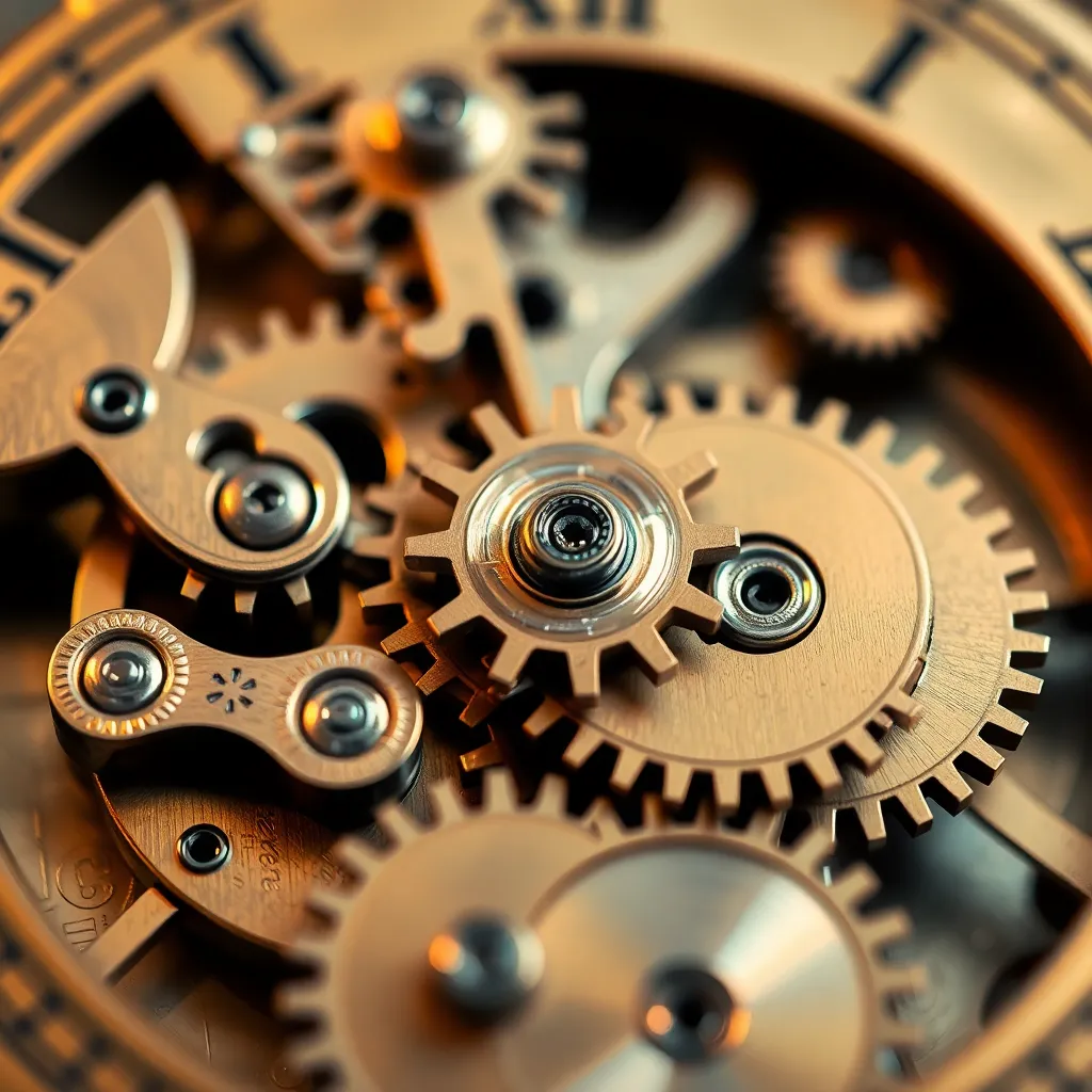 Create an extreme close-up of a delicate, antique clock mechanism, with intricate gears and cogs visible. The image should be sharp and detailed, with a warm, golden lighting that highlights the textures and patterns. The focus should be on the intricate details, with a blurred background to emphasize the subject.
