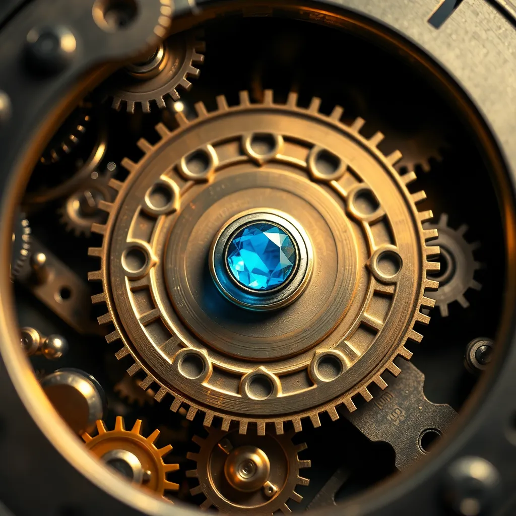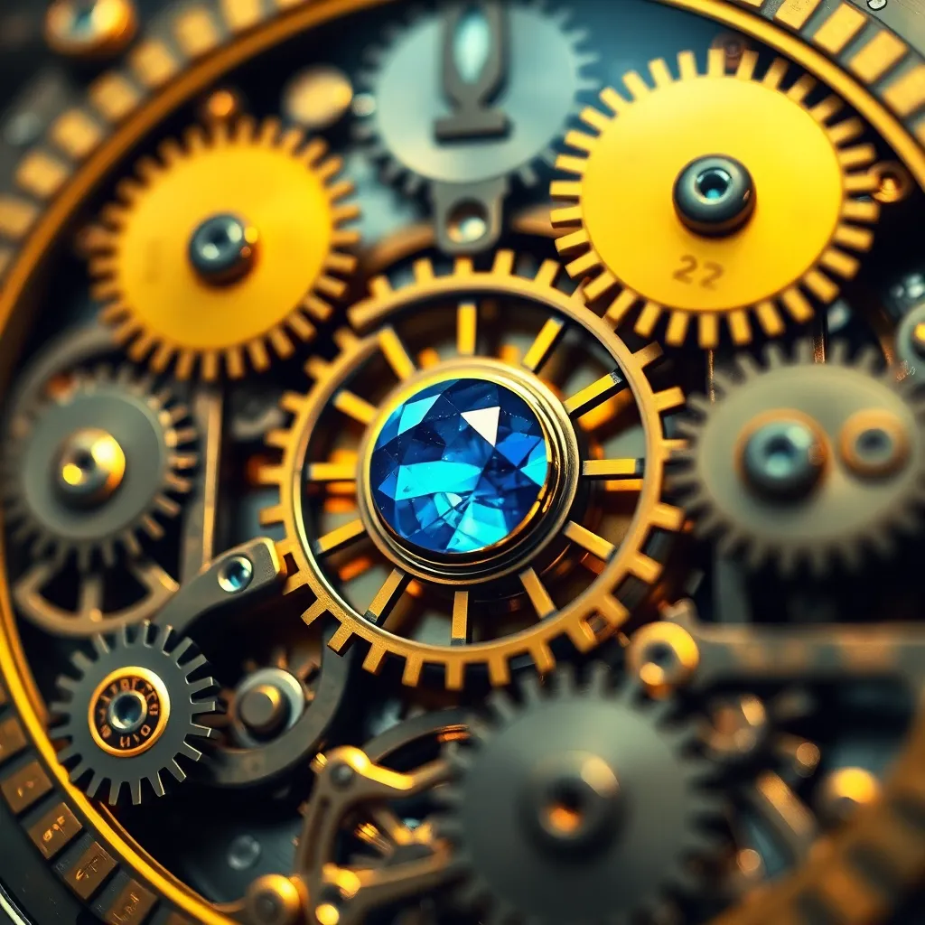 Create an extreme close-up of a mysterious, intricate clockwork mechanism, with tiny gears and cogs clicking into place. The camera zooms in on a single, glowing blue gemstone at the mechanism's center, surrounded by a halo of golden light. The image should exude a sense of intricate precision and wonder.