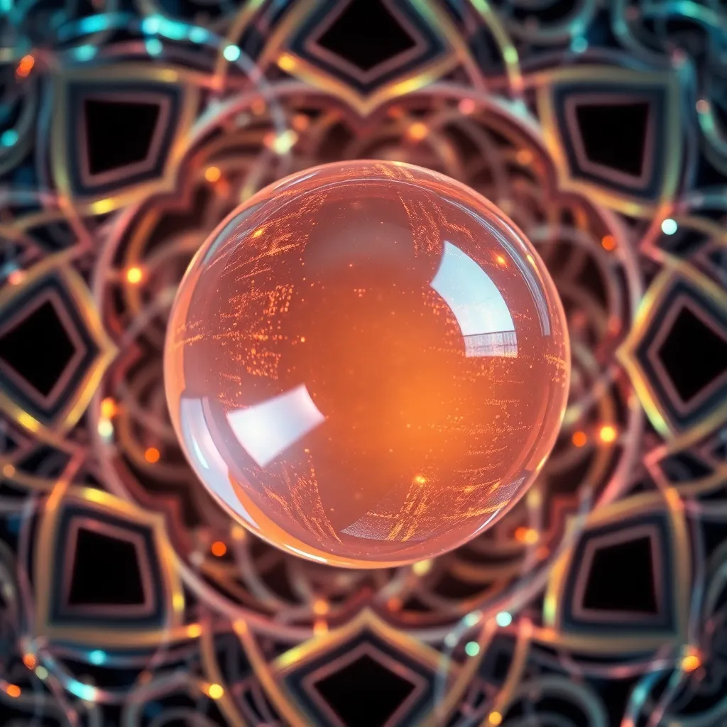Create an extreme close-up of a mesmerizing, glowing orb surrounded by intricate, swirling patterns of iridescent lights. The orb's surface appears to shift and pulse with an otherworldly energy, as if it's alive and radiating an intense, hypnotic power. Generate an image that's both captivating and surreal.