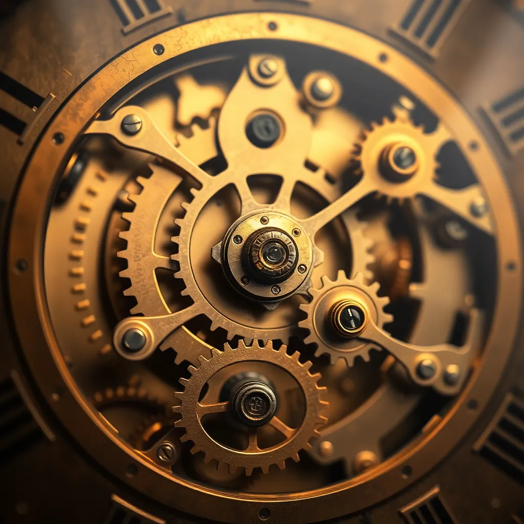 Create an extreme close-up of a vintage, intricately designed clock mechanism. Capture the intricate details of the gears, cogs, and springs, with a warm golden light illuminating the metalwork. Focus on the textures, patterns, and reflections to create a mesmerizing and detailed image that invites the viewer to explore.