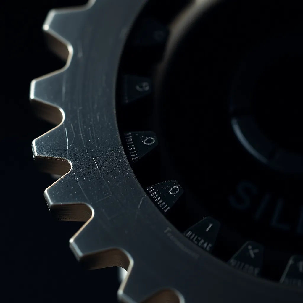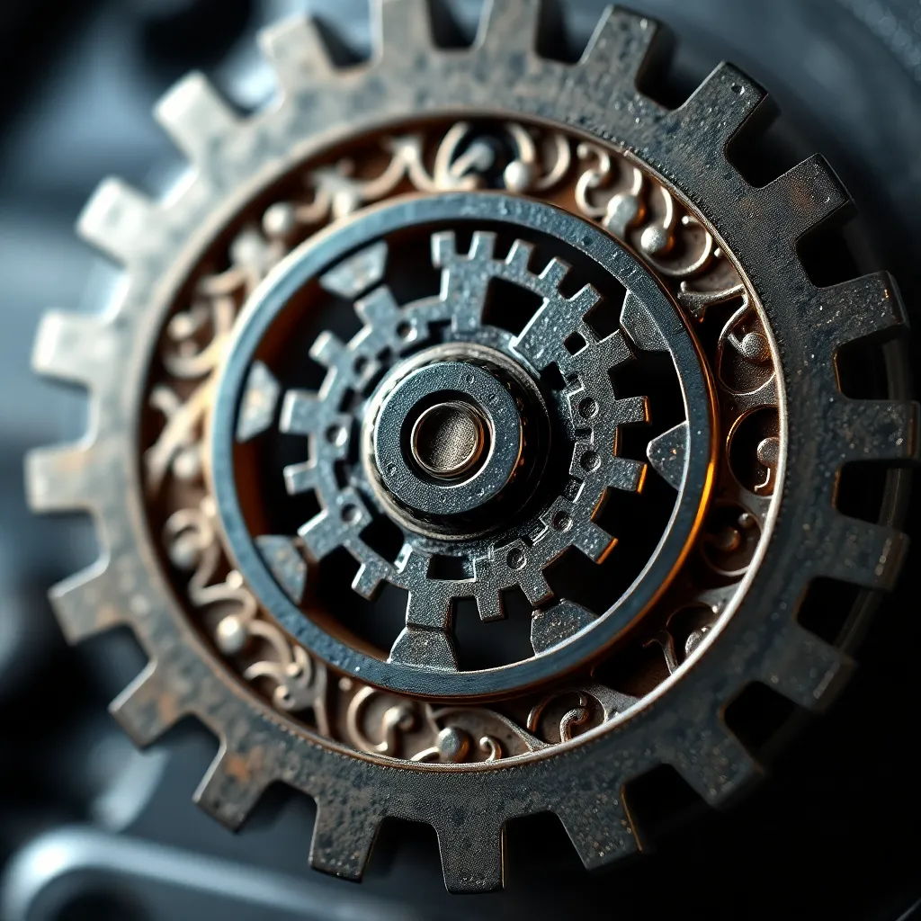 Create an extreme close-up of a delicate, intricately designed mechanical gear, with intricate patterns and textures magnified to reveal hidden details. The gear is set against a dark, metallic background, with subtle lighting accentuating the microscopic features. The resulting image should be breathtakingly detailed and visually striking.