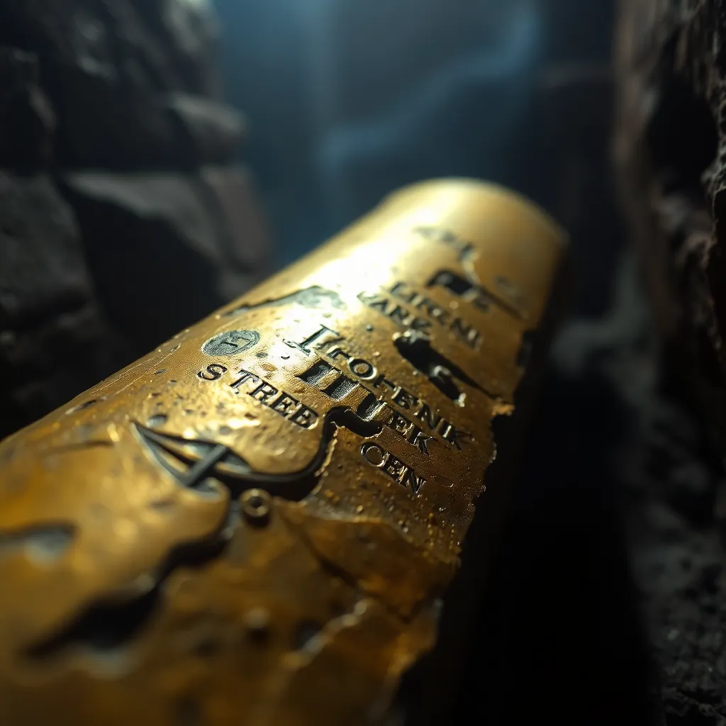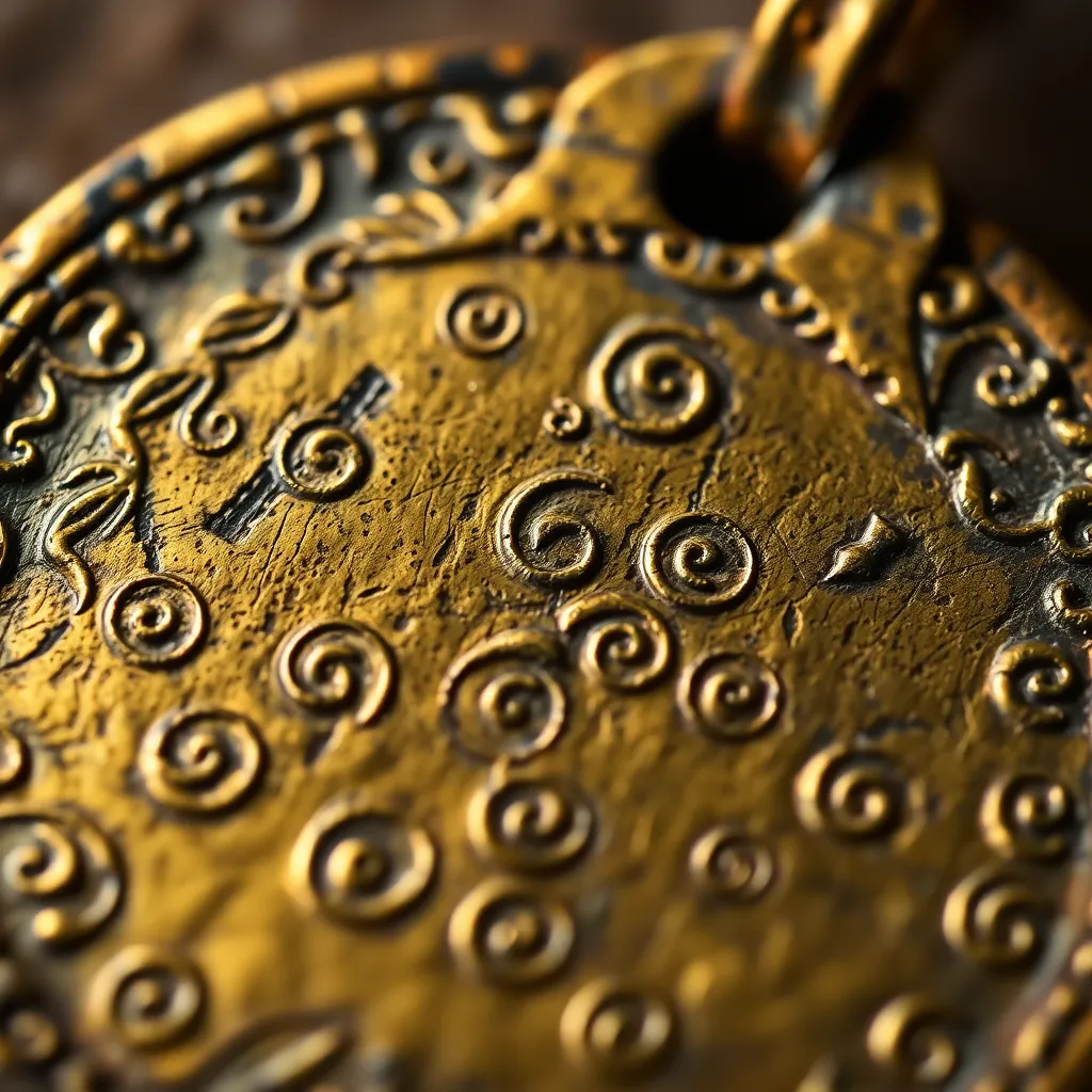 Capture the intricate details of a mysterious, ancient artifact. Zoom in on the worn, golden surface, revealing intricate etchings and micro-inscriptions. The surrounding environment is shrouded in darkness, with only a faint, flickering light illuminating the relic. The focus is sharp, with a shallow depth of field.