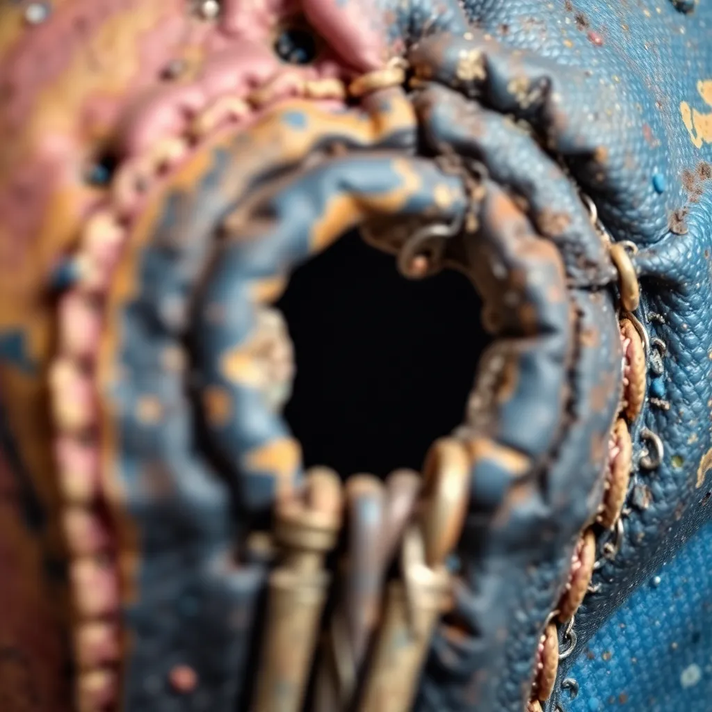 Create an extreme close-up of a peculiar, forgotten object, such as a vintage keyhole, a worn-out zipper, or a crumpled up piece of paper. Focus on the intricate textures, patterns, and details that reveal the object's unique character. Use vibrant colors and dramatic lighting to bring the subject to life.