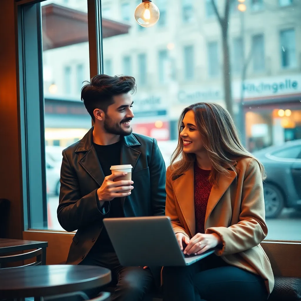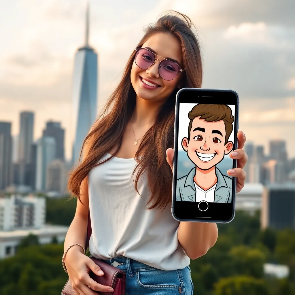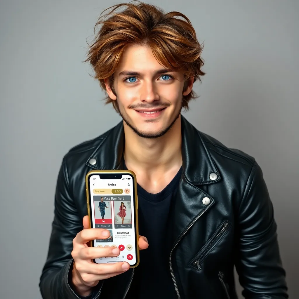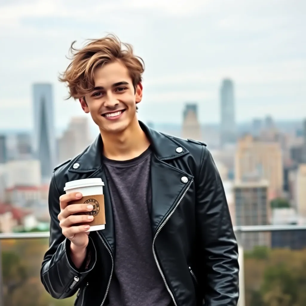 Create an AI image of a trendy, 25-year-old influencer, Alex, holding a coffee cup and standing in front of a city skyline. Alex has a charming smile and stylish, messy hair. They're wearing a sleek black leather jacket and distressed denim jeans. Use a filter that makes them look like a convincing fake boyfriend.