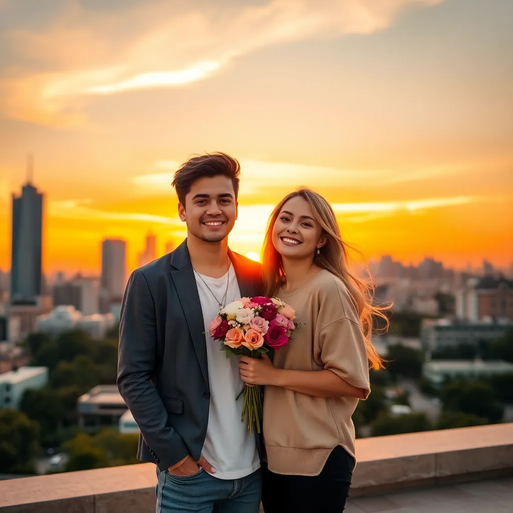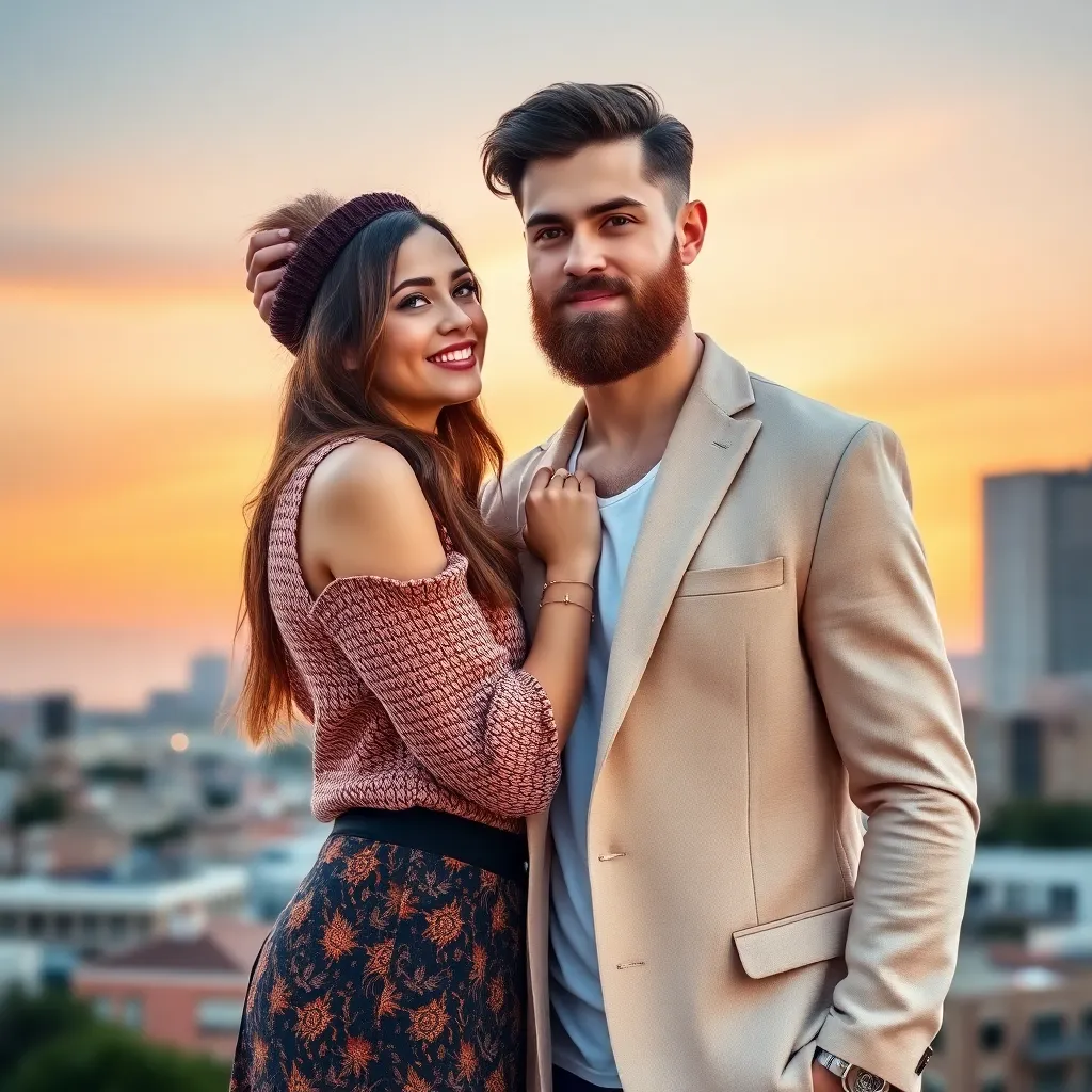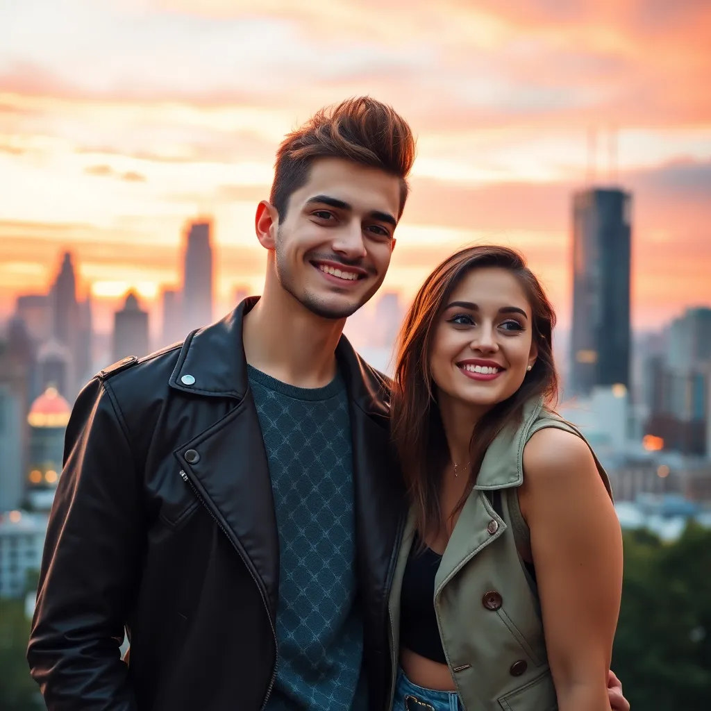 Create an image of a trendy young couple, with the boyfriend sporting a stylish haircut and a charming smile, posing in front of a vibrant cityscape at sunset. The girlfriend is dressed in a trendy outfit, gazing adoringly at her partner. The atmosphere is romantic and carefree, with a hint of whimsy.