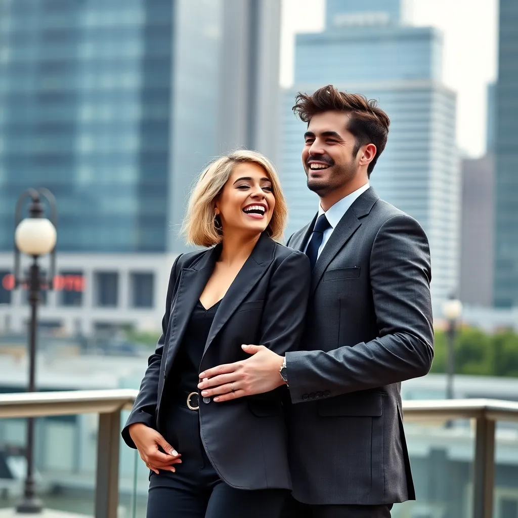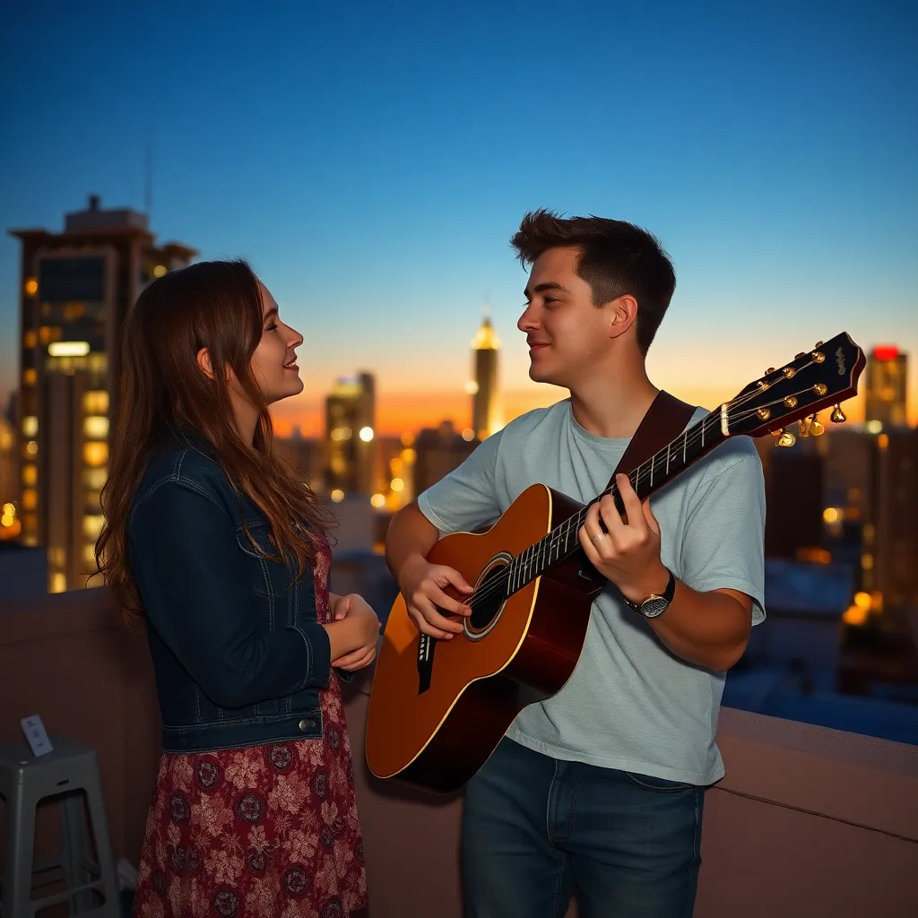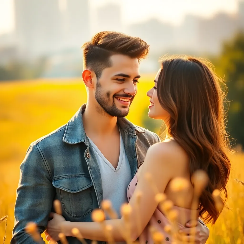 Create an image of a trendy young couple, with the boyfriend sporting a stylish haircut and a charming smile, posing in front of a vibrant cityscape at sunset. The girlfriend is dressed in a trendy outfit, gazing adoringly at her partner. The atmosphere is romantic and carefree, with a hint of whimsy.
