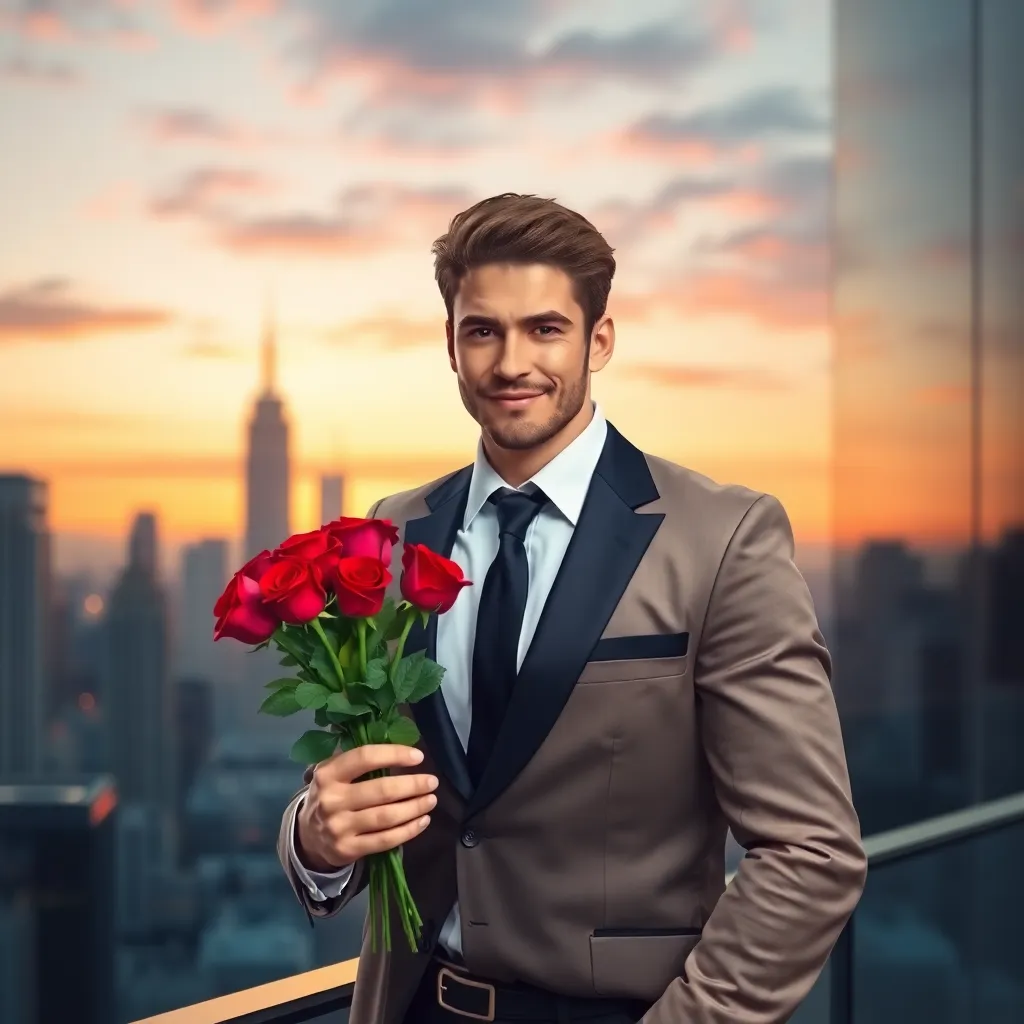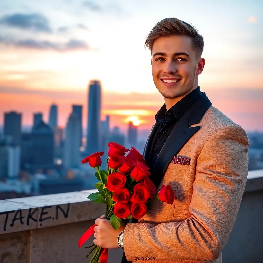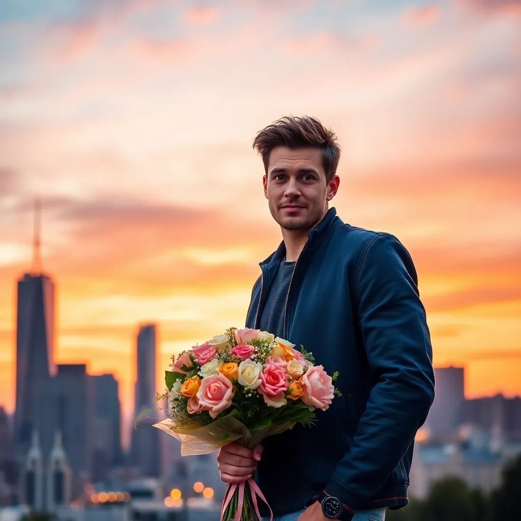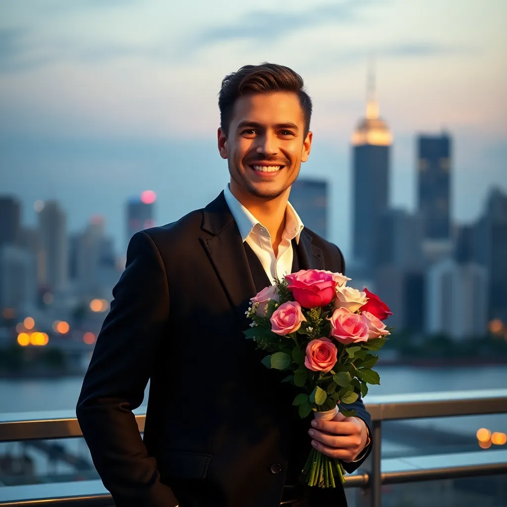 Create an AI-generated image of a charming and handsome fake boyfriend. He's dressed in a stylish outfit, has a charming smile, and is holding a bouquet of flowers. The setting is a romantic evening, with a city skyline in the background. The image should exude confidence, charm, and a touch of playfulness.