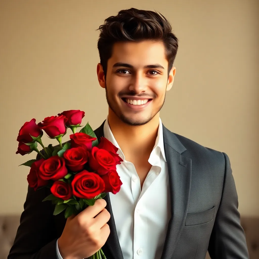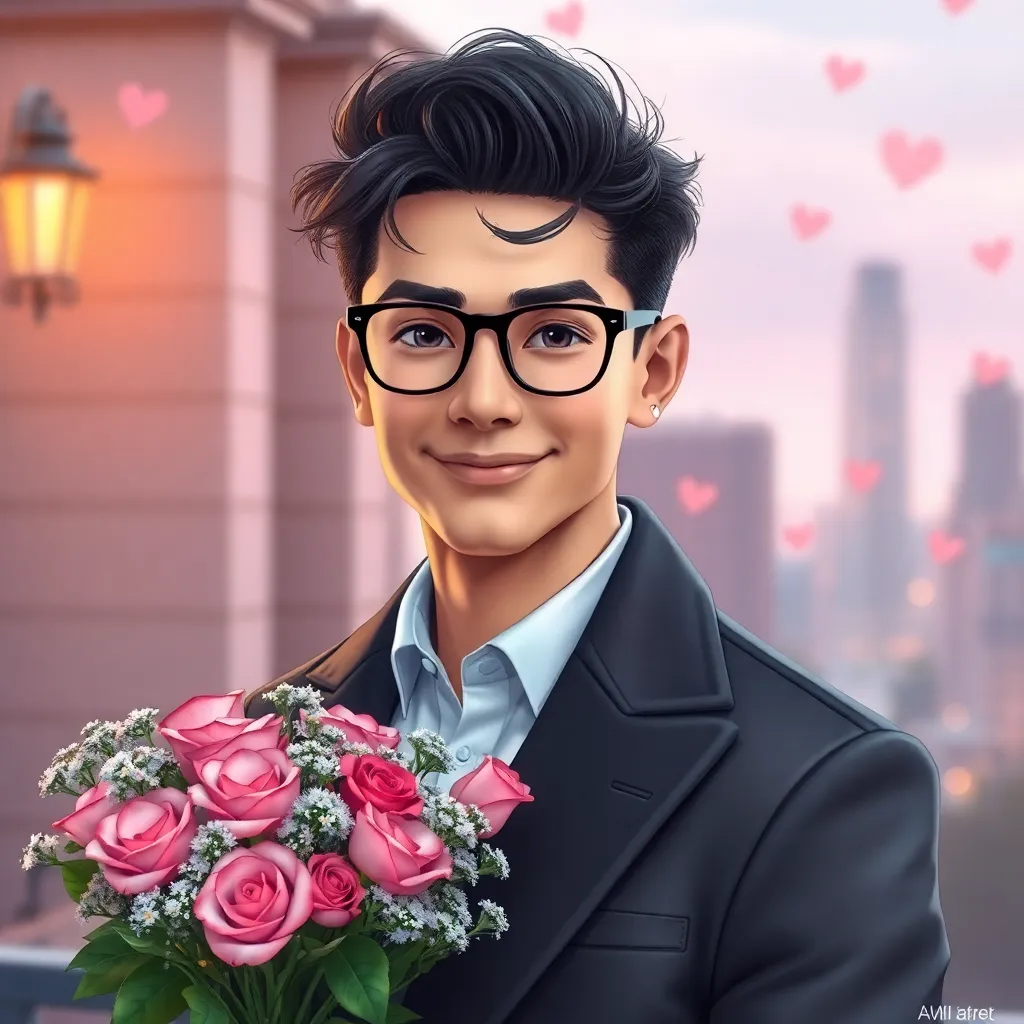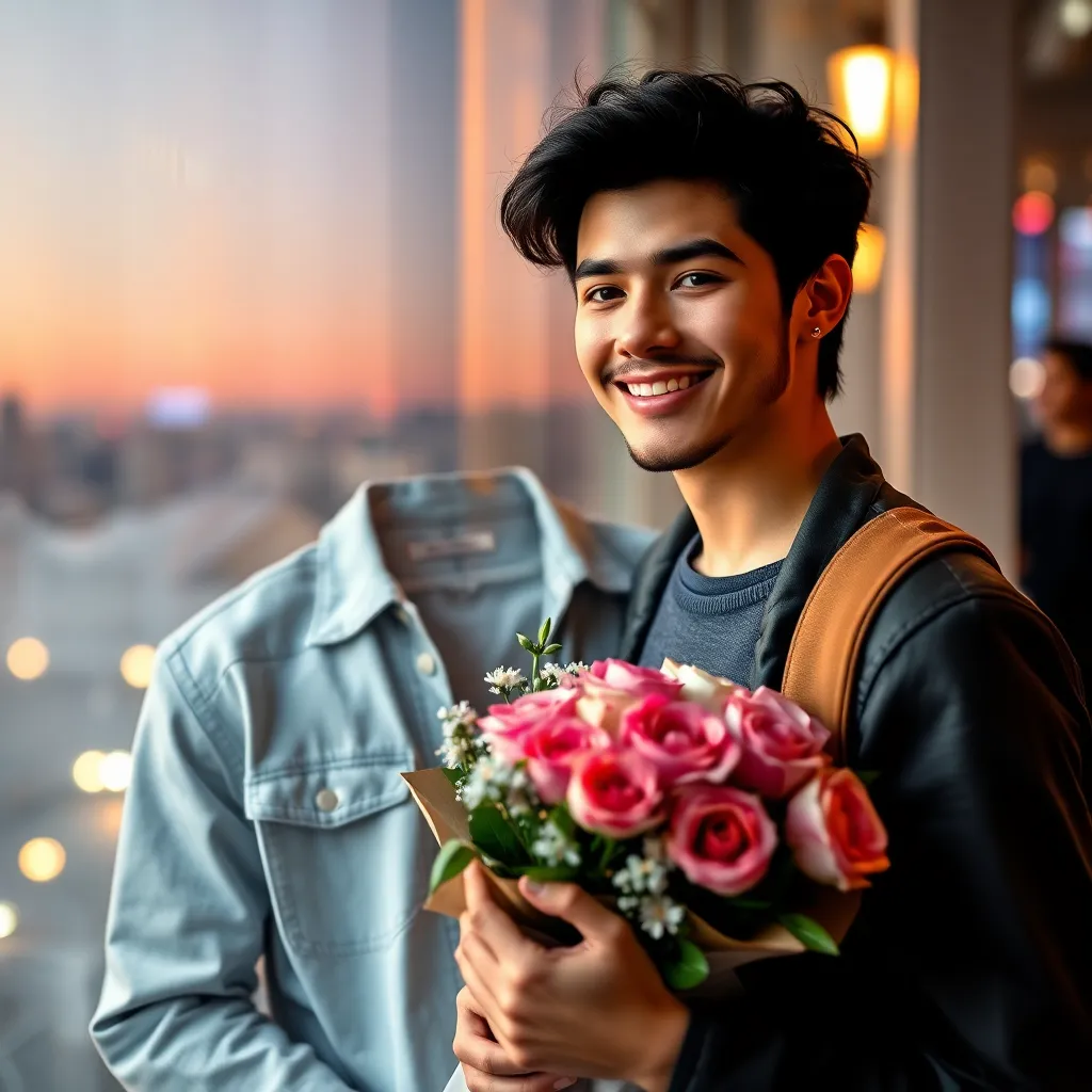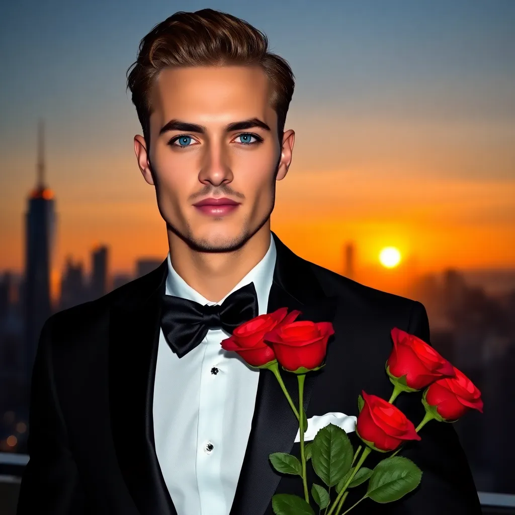 Create an AI-generated image of a charming and handsome fake boyfriend. He's dressed in a stylish outfit, has a charming smile, and is holding a bouquet of flowers. The setting is a romantic evening, with a city skyline in the background. The image should exude confidence, charm, and a touch of playfulness.
