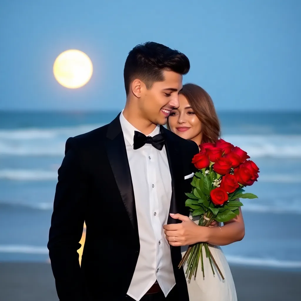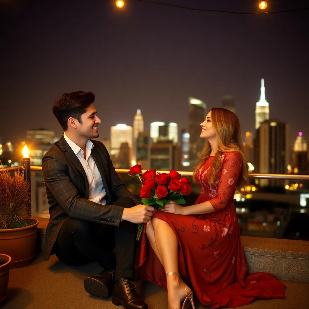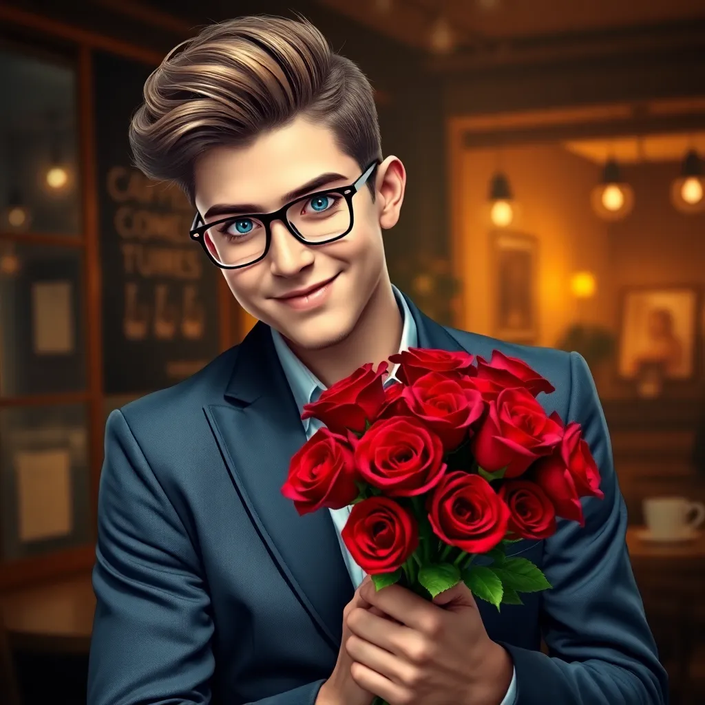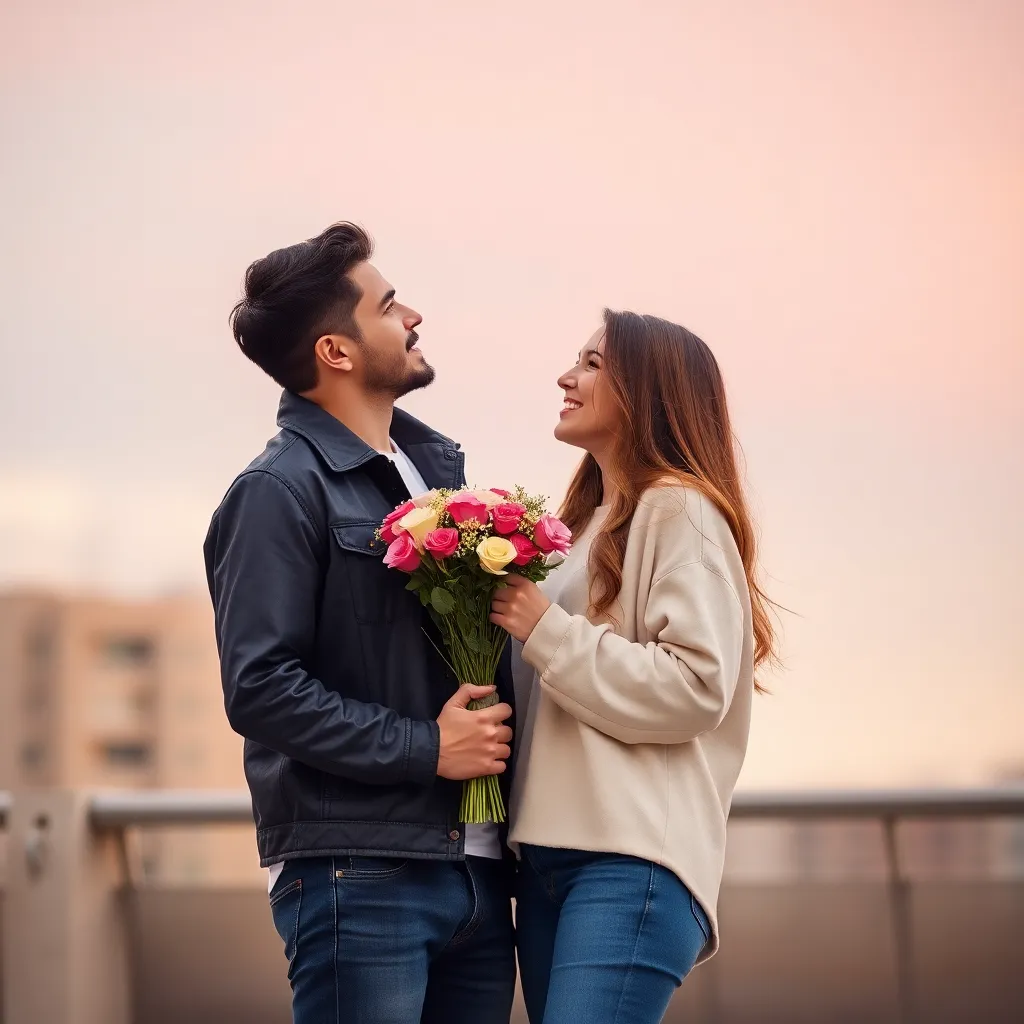 Create an AI-generated image of a charming and handsome fake boyfriend. He's dressed in a stylish outfit, has a charming smile, and is holding a bouquet of flowers. The setting is a romantic evening, with a city skyline in the background. The image should exude confidence, charm, and a touch of playfulness.