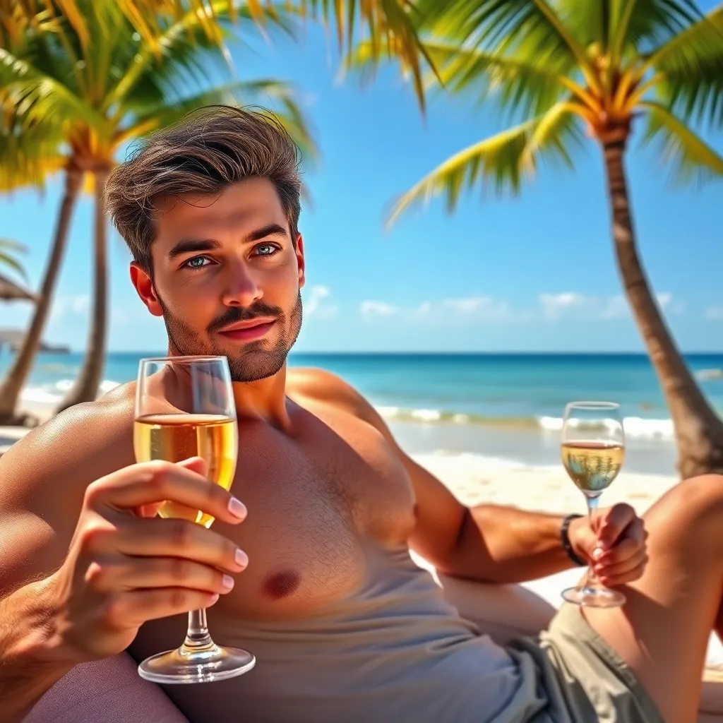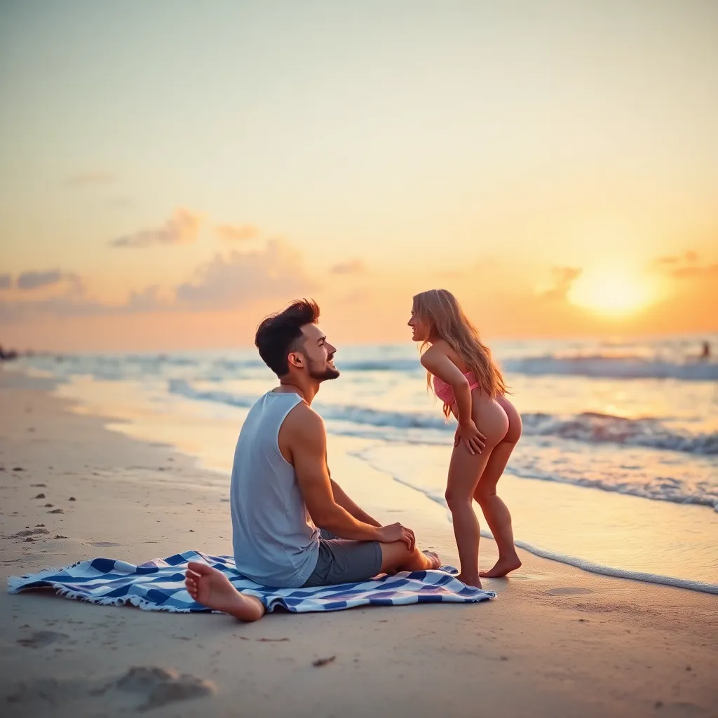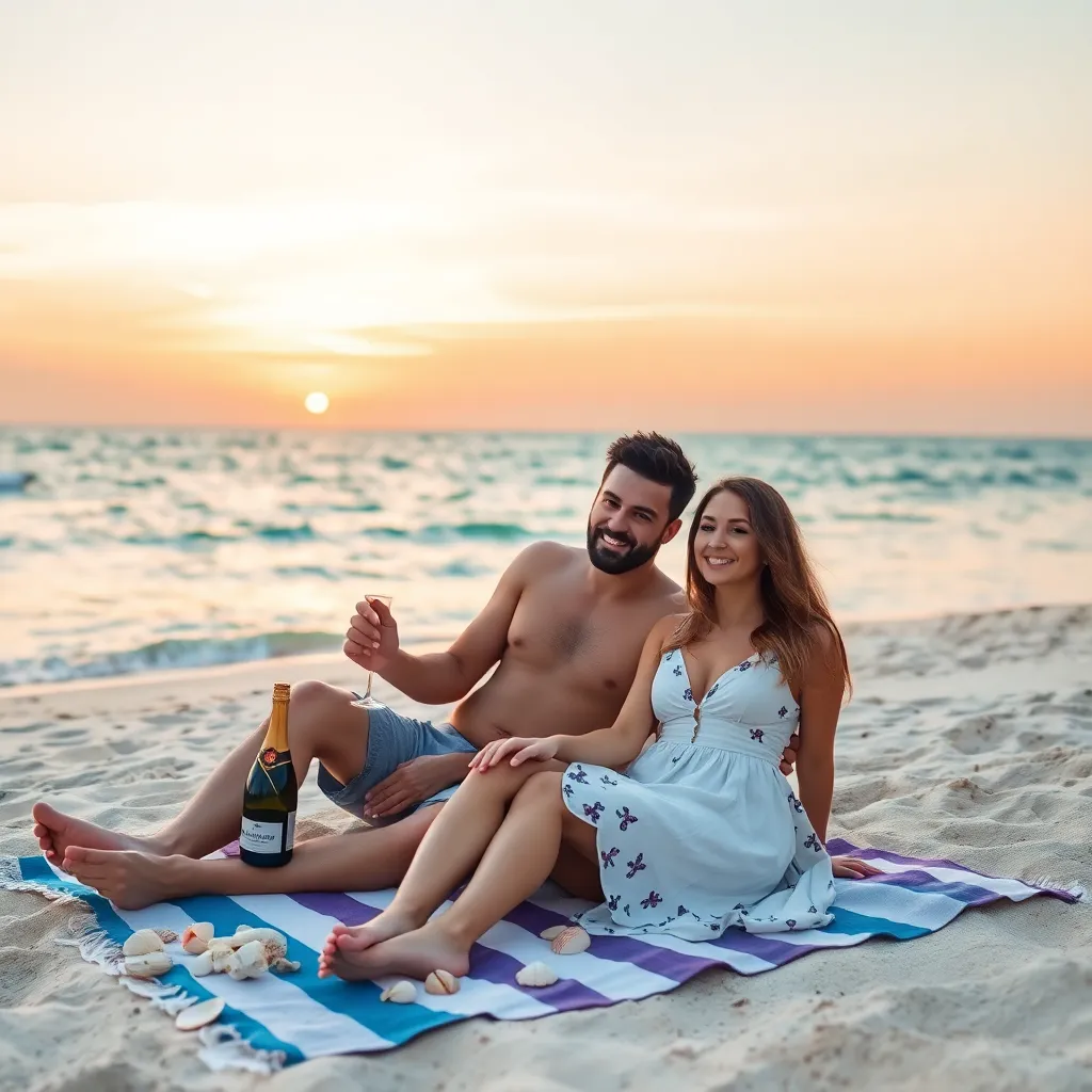 Create a romantic getaway for a couple using a fake boyfriend filter. The scene should take place on a picturesque beach at sunset, with the 'boyfriend' lounging on a beach towel, surrounded by seashells and a bottle of champagne. The 'girlfriend' should be sitting next to him, smiling and holding his hand.