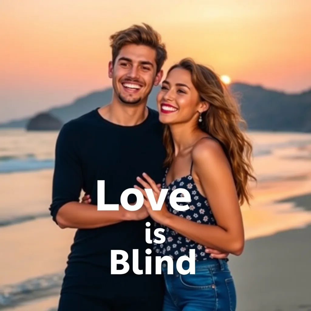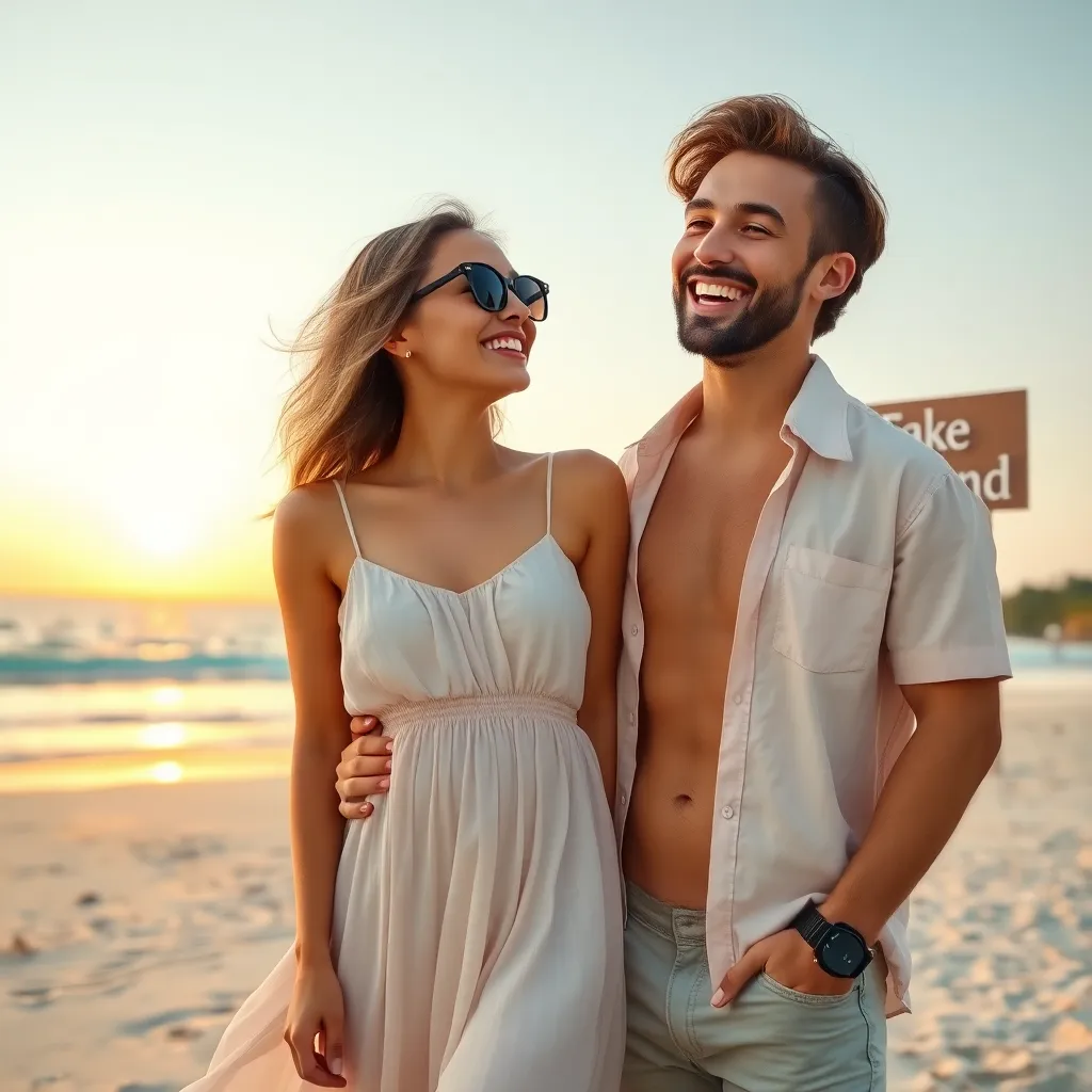 Create an AI image of a trendy young couple, both in their early twenties, posing on a picturesque beach at sunset. The girl is wearing a flowy sundress and sunglasses, while the guy is sporting a laid-back outfit and a charming smile. They're laughing and embracing, with a 'Fake Boyfriend' sign in the background.