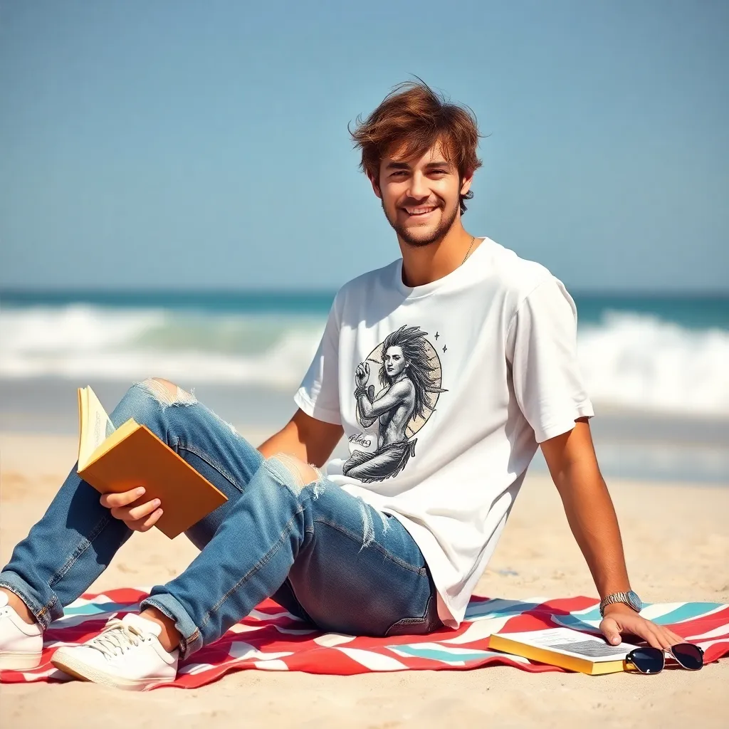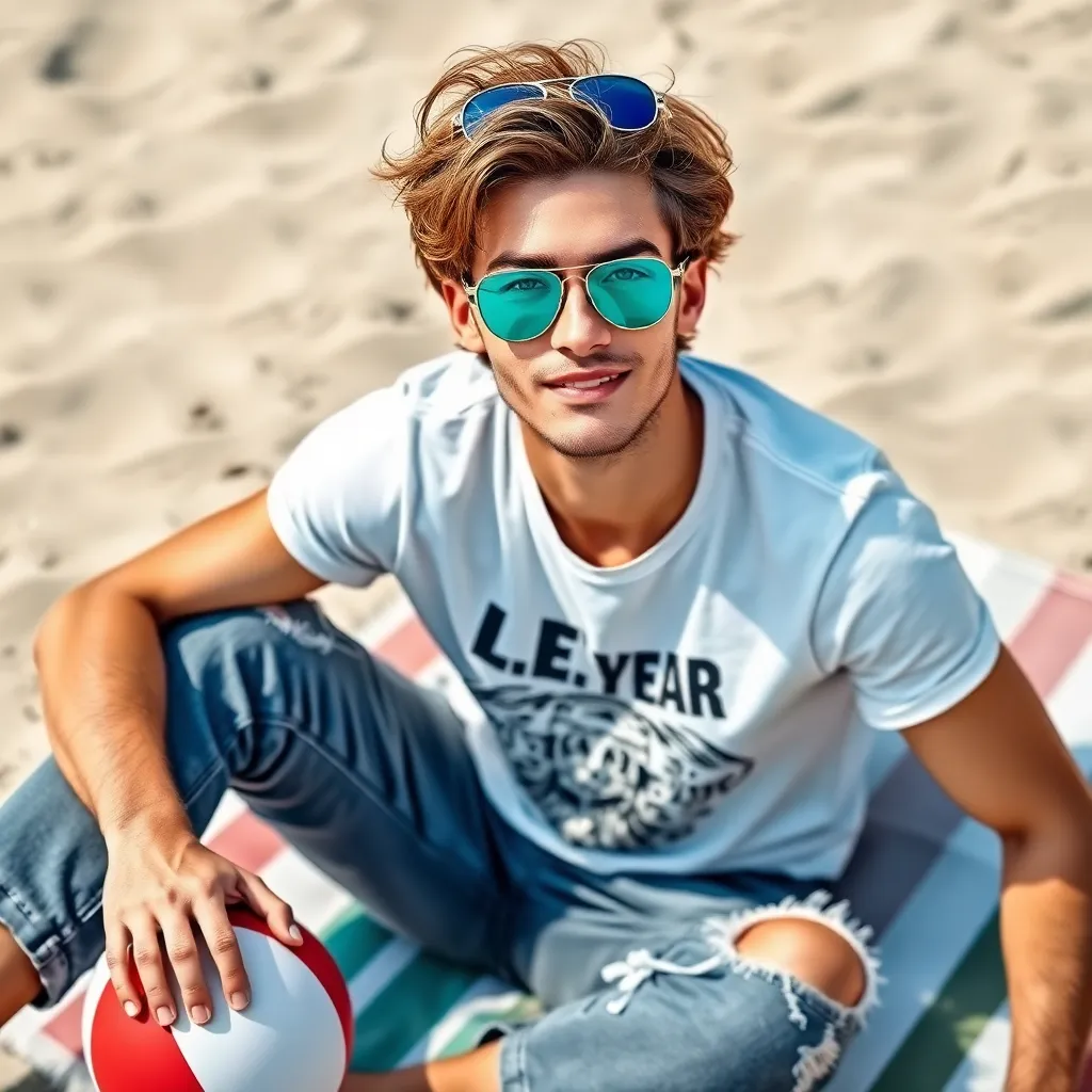 Create an AI-generated image of a charming, laid-back guy with messy brown hair and bright blue eyes, wearing a white graphic tee and ripped jeans, sitting on a beach towel with a beach ball and sunglasses, giving a relaxed, 'who cares?' expression, as if he's pretending to be my perfect fake boyfriend.