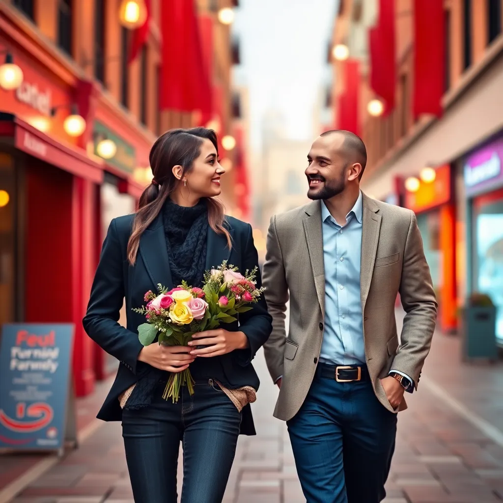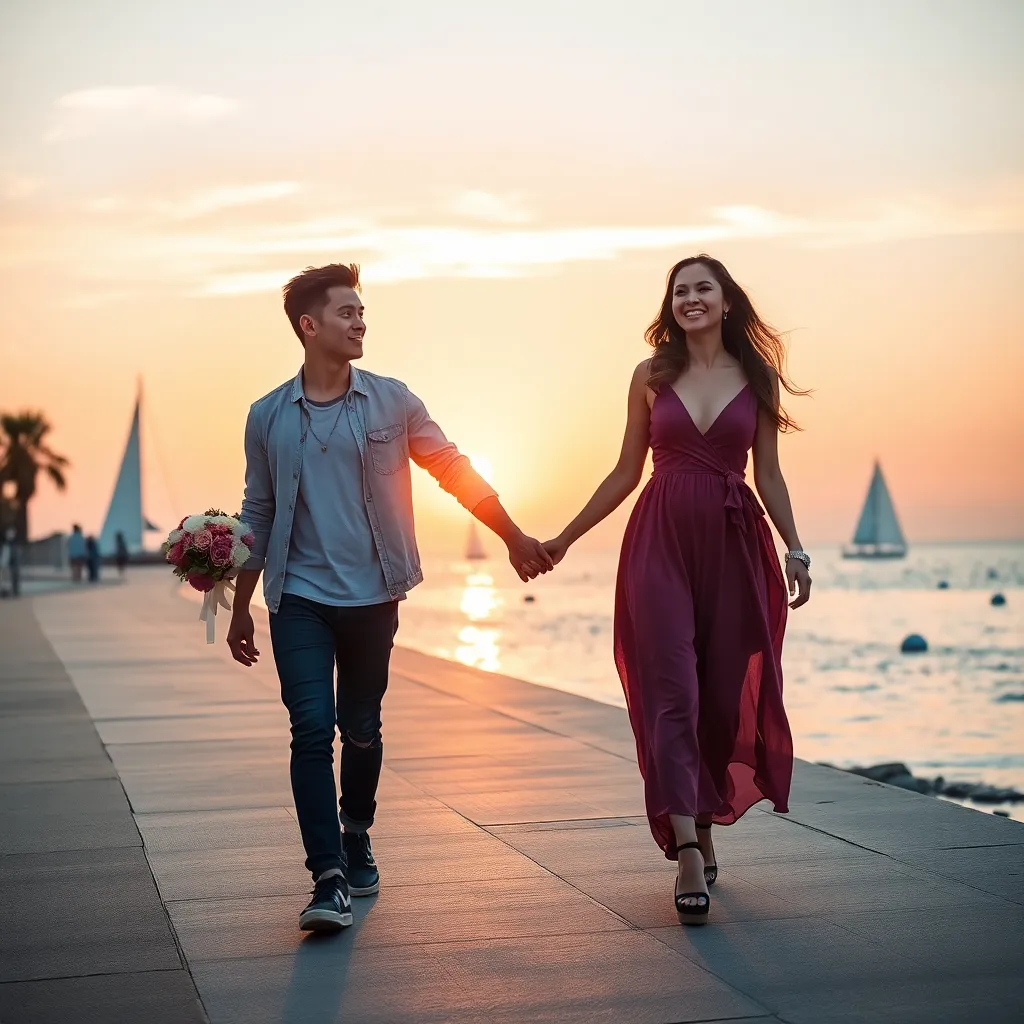 Create a romantic and playful scene of a young couple, hand in hand, walking along a beachside promenade at sunset. The man is wearing a trendy outfit and holding a bouquet of flowers, while the woman is dressed in a flowy dress and has a big smile on her face. Use a filter that adds a whimsical, dreamy quality to the image, with pastel colors and soft focus. The background should feature a serene ocean view with sailboats and palm trees.