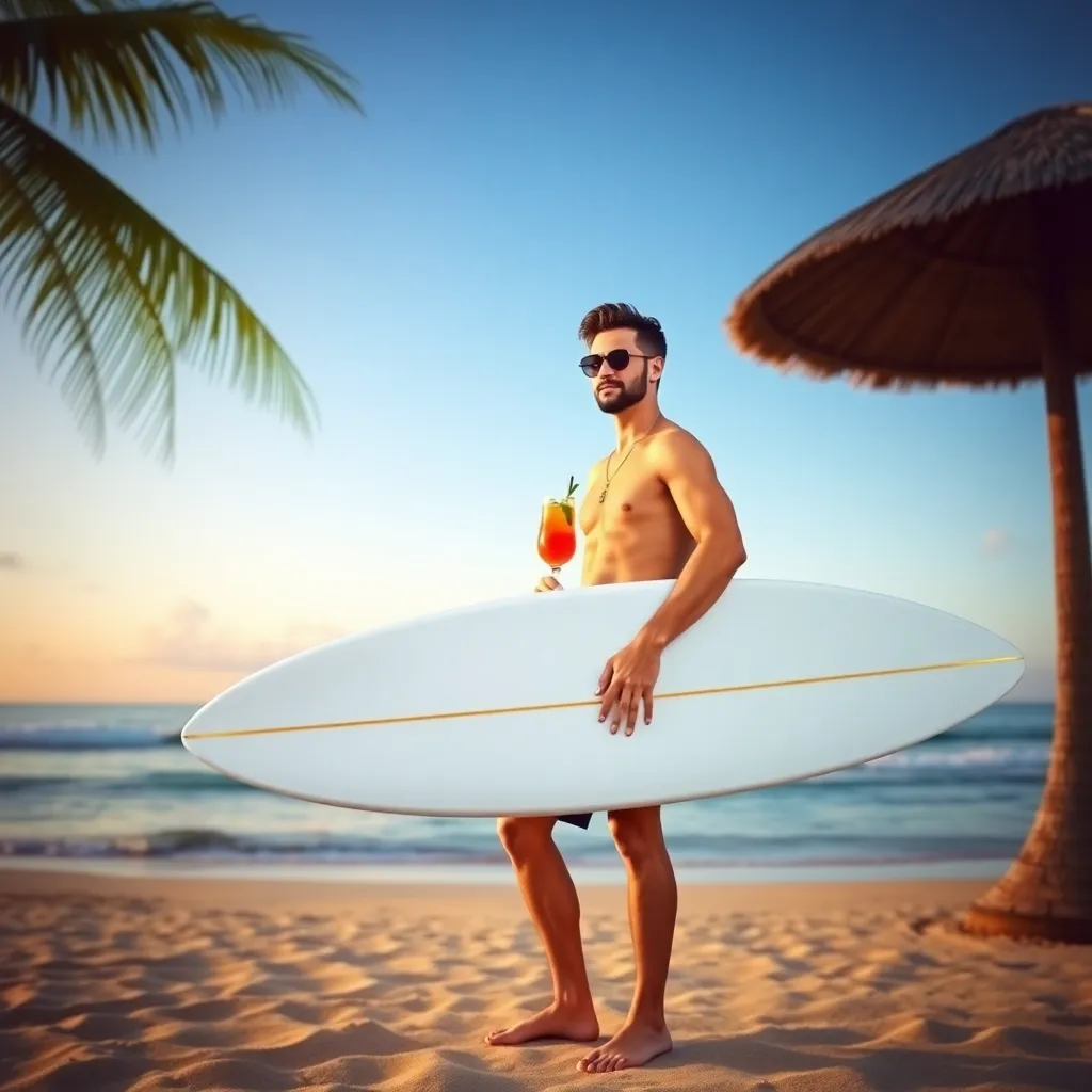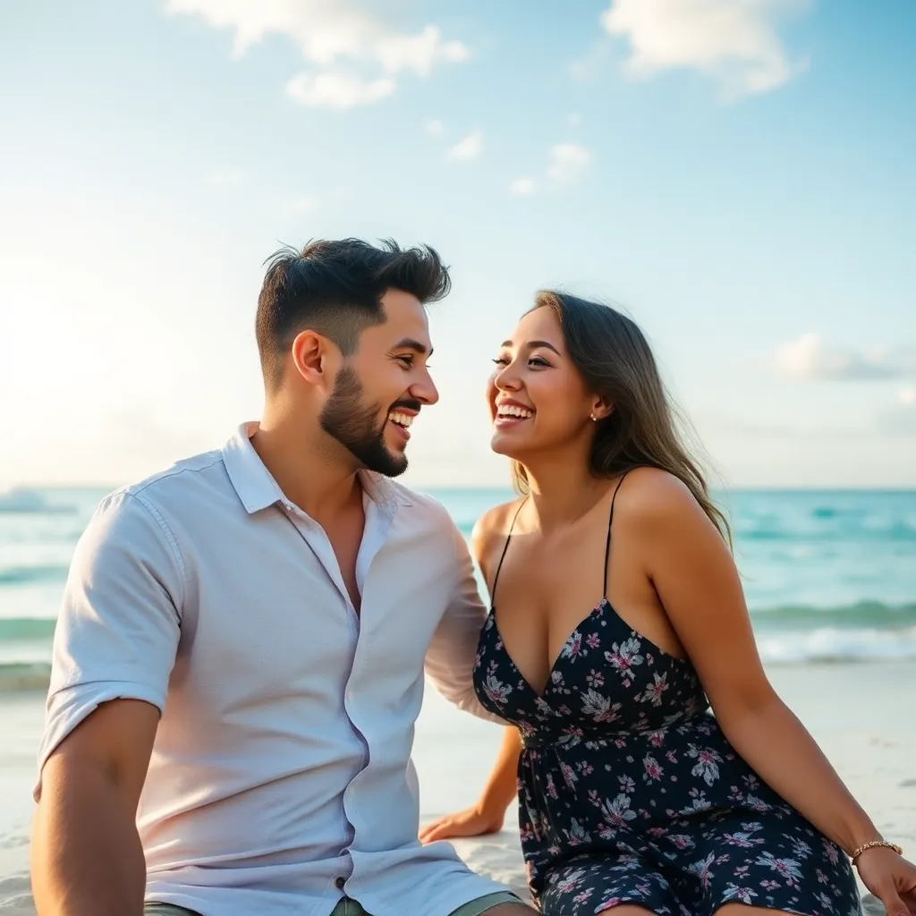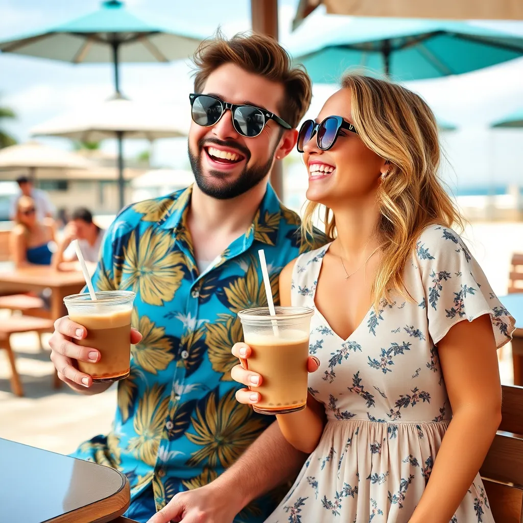 Create an AI image of a trendy couple, 'Alex and Maddie', using the Fake Boyfriend Filter. They're at a beachside cafe, laughing and holding iced coffee drinks. Alex is dressed in a bold Hawaiian shirt and sunglasses, while Maddie wears a flowy sundress and a bright smile. The filter should enhance their chemistry and make them look like a perfect, happy couple.