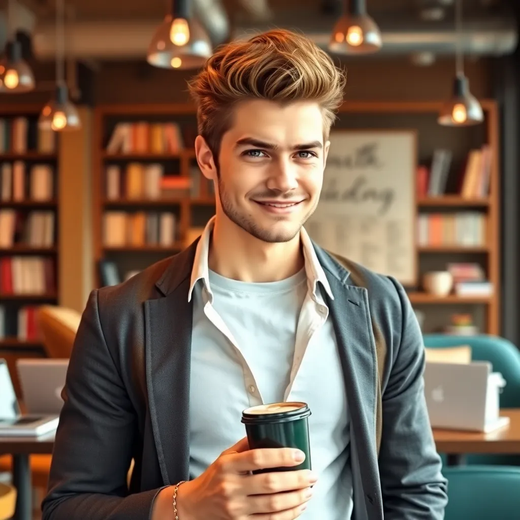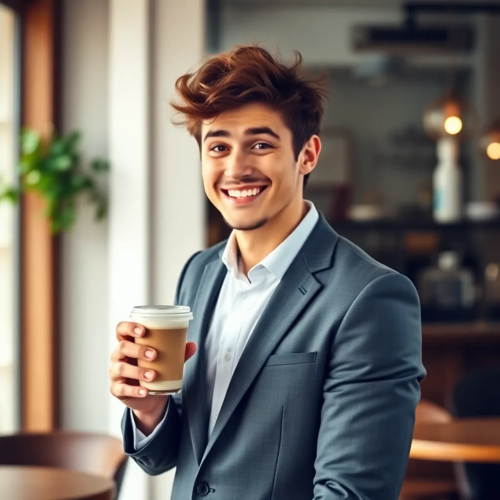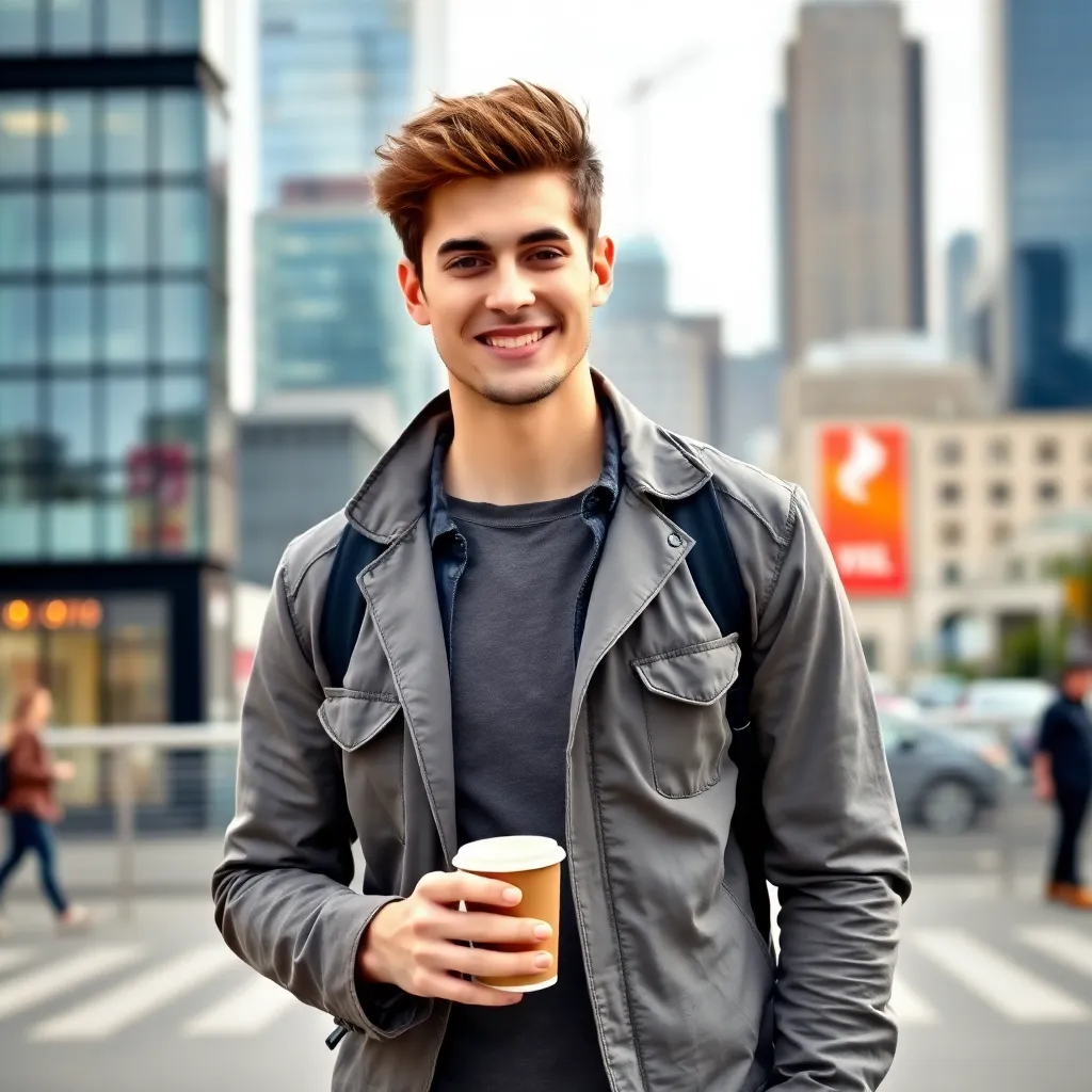 Create an AI-generated image of a handsome young man with a charming smile, dressed in a stylish outfit, standing in front of a trendy cityscape. He's holding a coffee cup and has a relaxed, 'just woke up' vibe. Add subtle hints of a 'fake boyfriend' persona, such as a fake ID or a script in his hand.