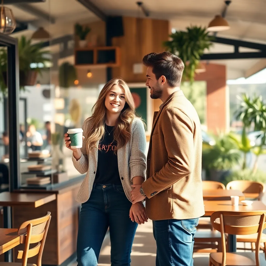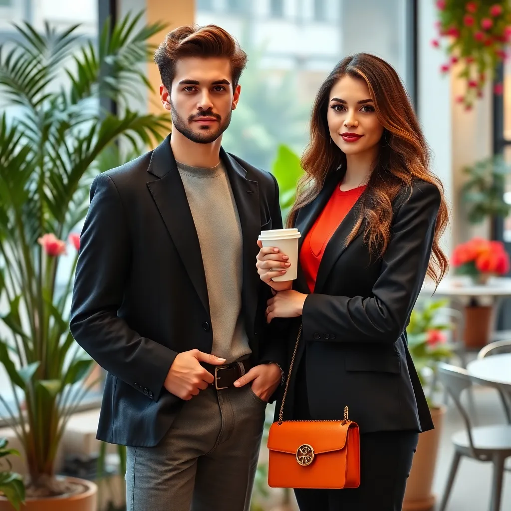 Create an AI-generated image of a stylish couple, a fashion-conscious young woman and her 'fake boyfriend', a charming stranger she hired to boost her social media presence. They're posing in a trendy coffee shop, surrounded by lush greenery and vibrant flowers, exuding confidence and a sense of playful deception.
