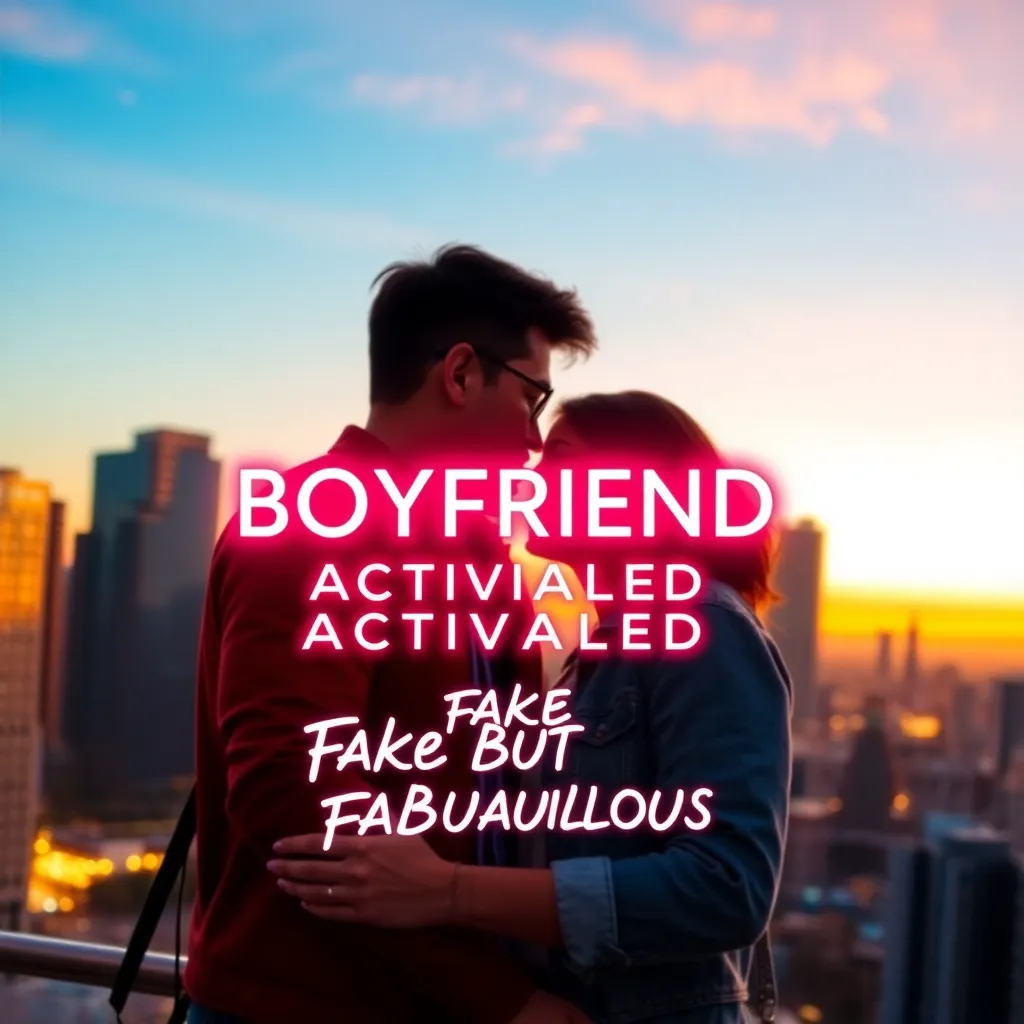 Create an AI-generated image of a trendy couple embracing in a vibrant cityscape at sunset, with the 'Fake Boyfriend Filter' overlaid on top, featuring bold, neon-lit words 'BOYFRIEND MODE ACTIVATED' and 'FAKE BUT FABULOUS' in a playful, cursive font, with a subtle gradient effect to match the warm colors of the scene.