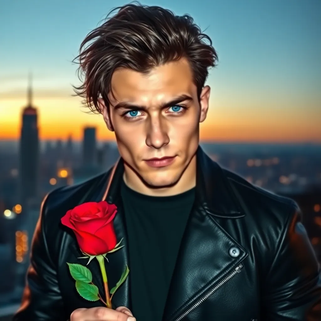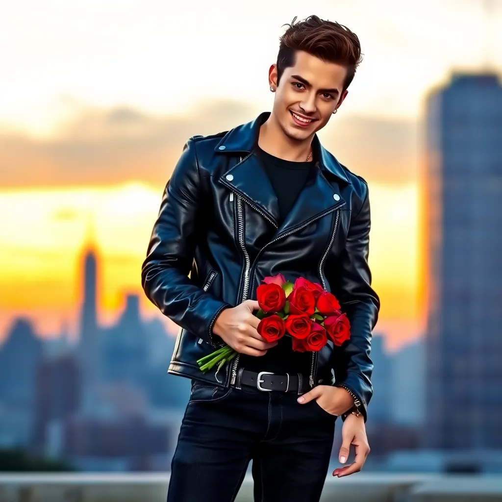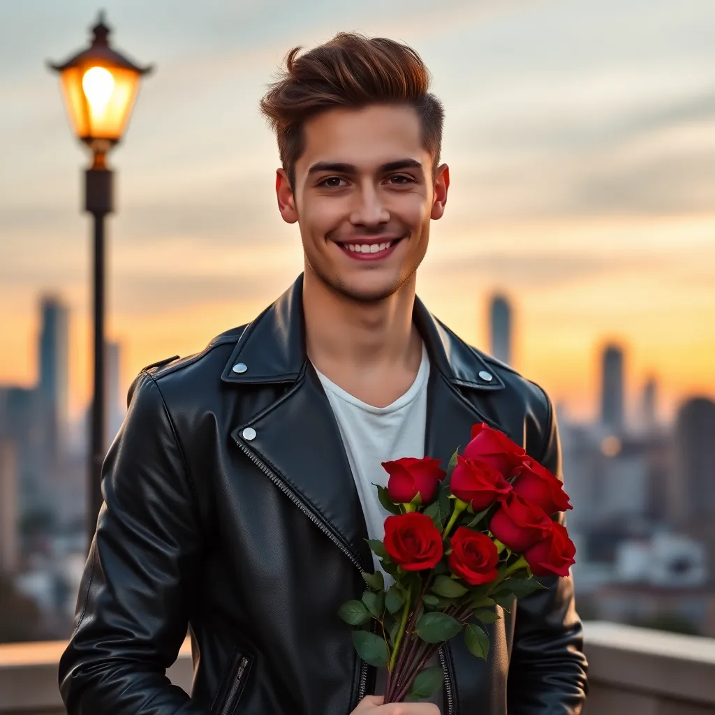 Create an image of a charming and handsome young man with a mischievous grin, dressed in a sleek black leather jacket and holding a bouquet of red roses. He's standing in front of a city skyline at sunset, with a city streetlamp casting a warm glow. Make him look like a fake boyfriend who's secretly in love with his girlfriend.