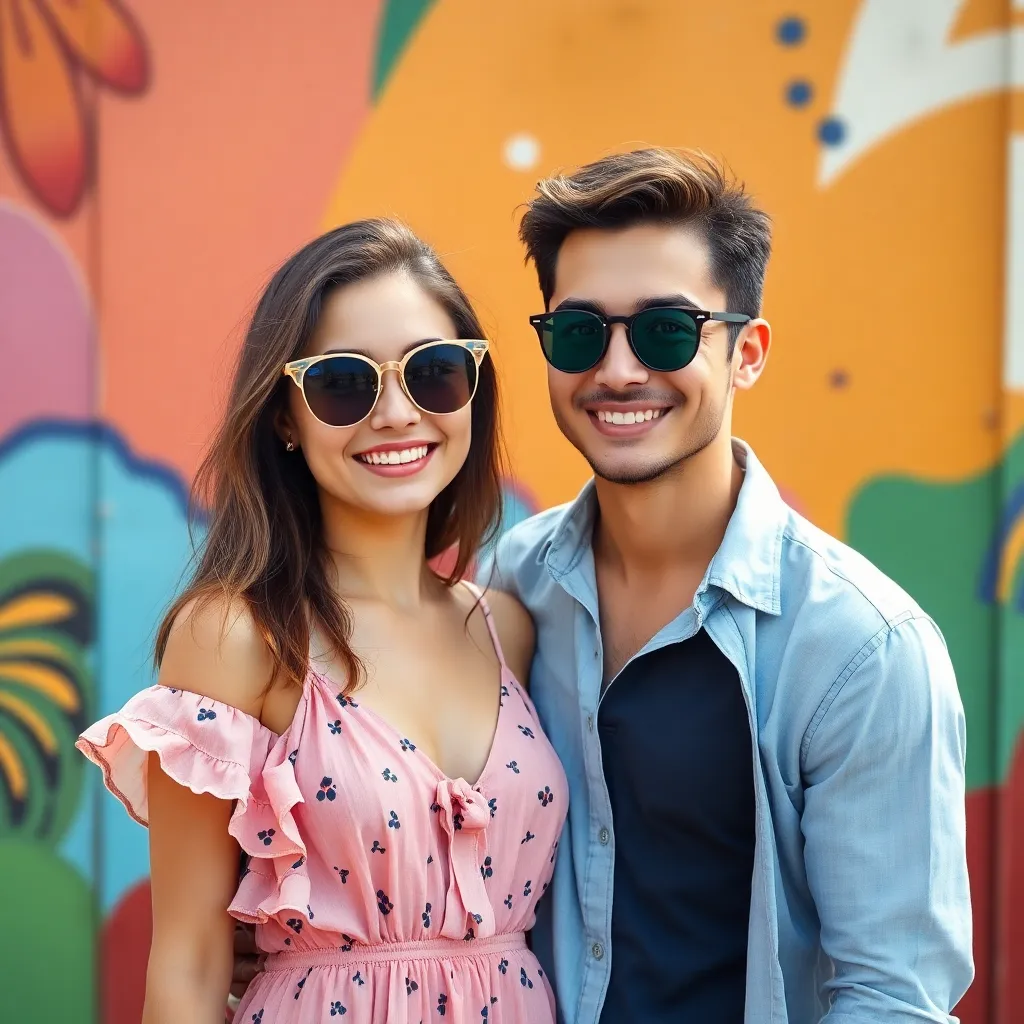 Create an AI-generated image of a trendy, 20-something couple, with the woman wearing a flowy sundress and sunglasses, and the 'fake boyfriend' donning a charming smile, standing in front of a colorful, vintage-style backdrop, capturing the essence of a summer romance, with a hint of playful deception.