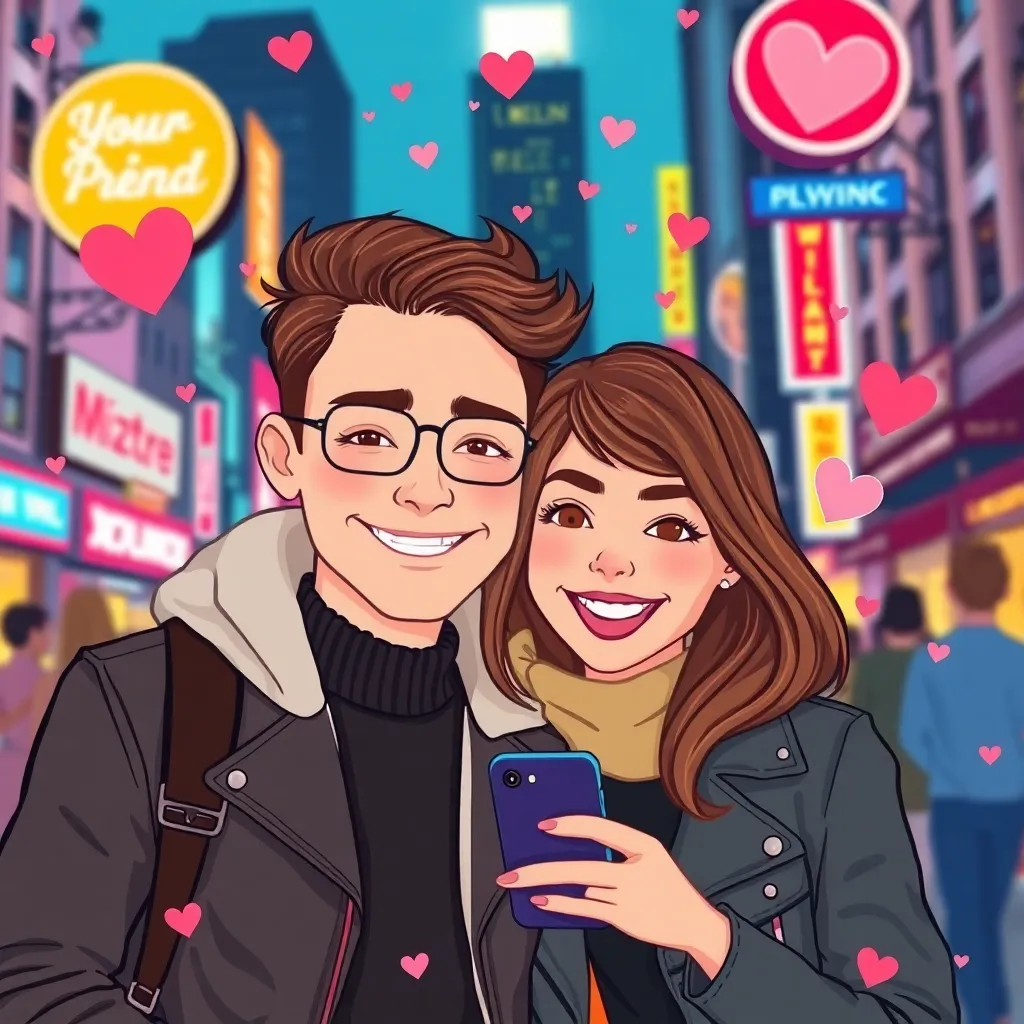 Create a whimsical illustration of a trendy couple, surrounded by city lights and neon signs, as they use a 'Fake Boyfriend Filter' on their phones, swapping their real faces for cartoonishly chiseled features. Incorporate playful digital elements, like hearts and confetti, to convey the lighthearted and humorous tone.