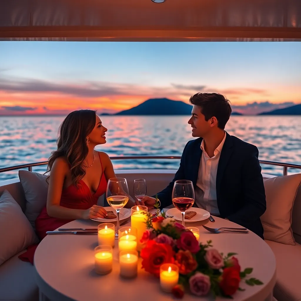 Create a romantic getaway scene with a couple enjoying a sunset dinner on a luxurious yacht. The boyfriend is dressed in a crisp white shirt and navy blazer, while the girlfriend wears a stunning red dress. The atmosphere is intimate, with candles and flowers surrounding them. Make the image dreamy and idyllic.
