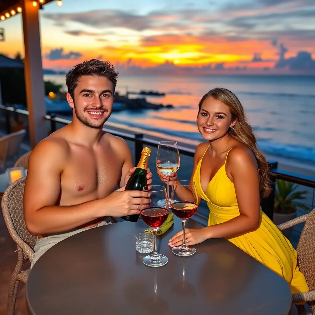 Create a romantic getaway scene where a handsome young couple, Alex and Maddie, are enjoying a sunset dinner on a luxurious beachside patio. Alex is holding a bottle of champagne and Maddie is wearing a stunning yellow sundress, both with big smiles and sparkling eyes, capturing the magic of their love.