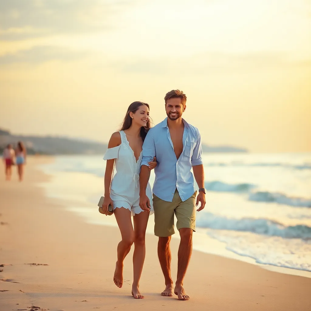 Create a romantic getaway scene where a stylish young couple, dressed in summer attire, are walking hand-in-hand on a picturesque beach at sunset. The atmosphere is relaxed and intimate, with a warm glow emanating from the setting sun. Use pastel colors and soft focus to capture the dreamy ambiance.