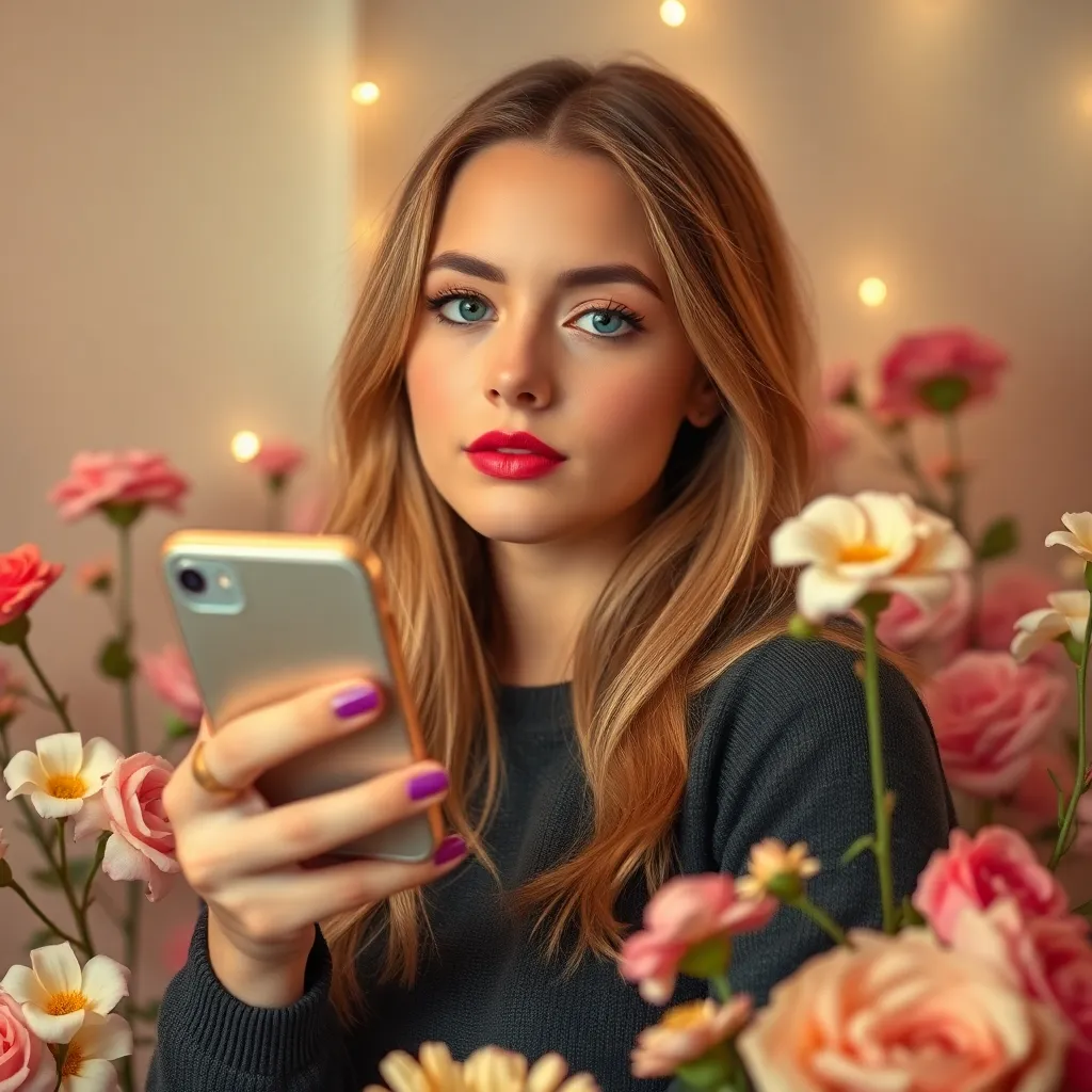 Create an AI-generated image of a trendy young woman, surrounded by flowers and soft lighting, holding a phone with a fake boyfriend's profile picture on the screen. The atmosphere is whimsical and romantic, with a hint of humor and playfulness. The woman's expression is thoughtful and introspective.