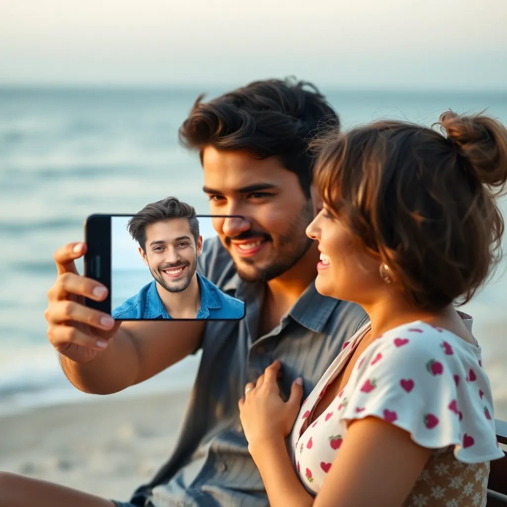 Create a romantic getaway scene featuring a couple using a 'Fake Boyfriend Filter' on their smartphone. The filter is superimposing a handsome stranger onto the boyfriend, who's oblivious to the deception. Capture the surprise and shock on the girlfriend's face as she discovers the unexpected twist.