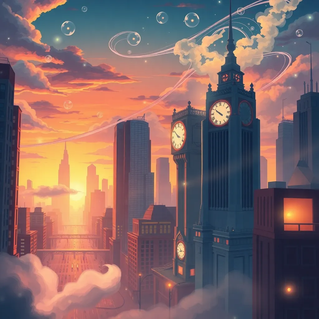 Create a whimsical illustration of a futuristic cityscape at sunset, with towering skyscrapers and neon-lit streets. Incorporate a prominent clock tower with a glowing face, surrounded by floating clouds and wispy smoke. Add a hint of mystical energy with swirling auras and subtle, shimmering lights.