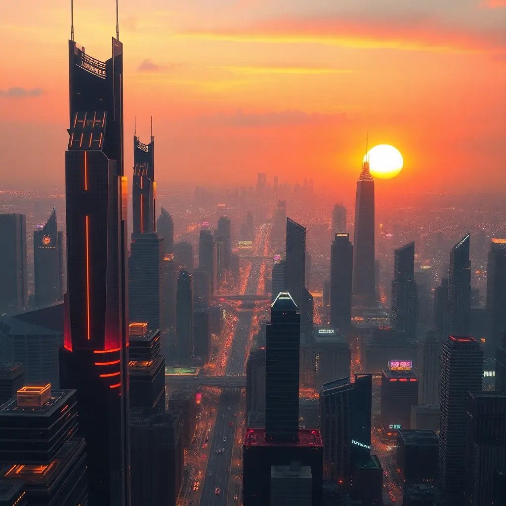 Create a futuristic cityscape at sunset, with sleek skyscrapers, neon-lit streets, and a sprawling metropolis skyline. Incorporate a vibrant color palette, with warm oranges and yellows dominating the scene. Add a sense of depth and dimensionality, with atmospheric haze and subtle texture. Make it a breathtaking, otherworldly city.
