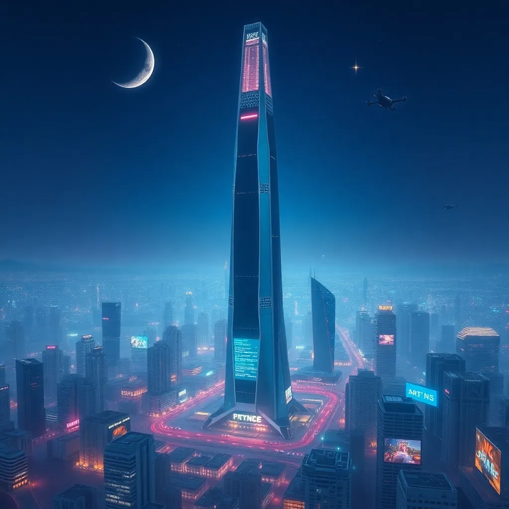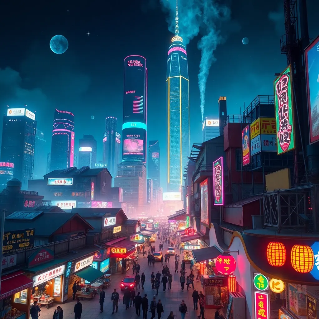 Create an image of a futuristic cityscape with a vibrant, neon-lit night market. Incorporate towering skyscrapers, bustling streets, and a mix of traditional and modern architecture. Add a sense of energy and excitement with twinkling lights, colorful billboards, and a hint of steam rising from the streets.