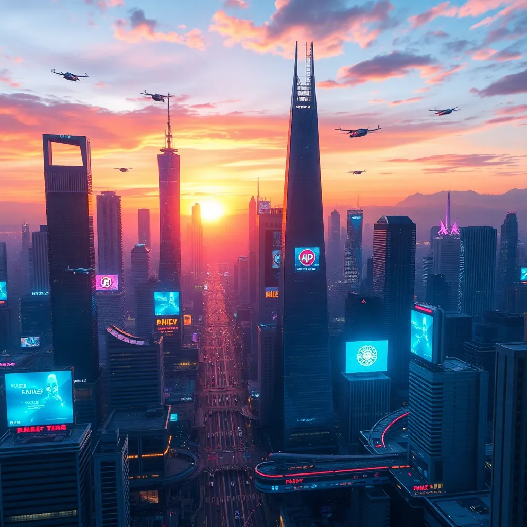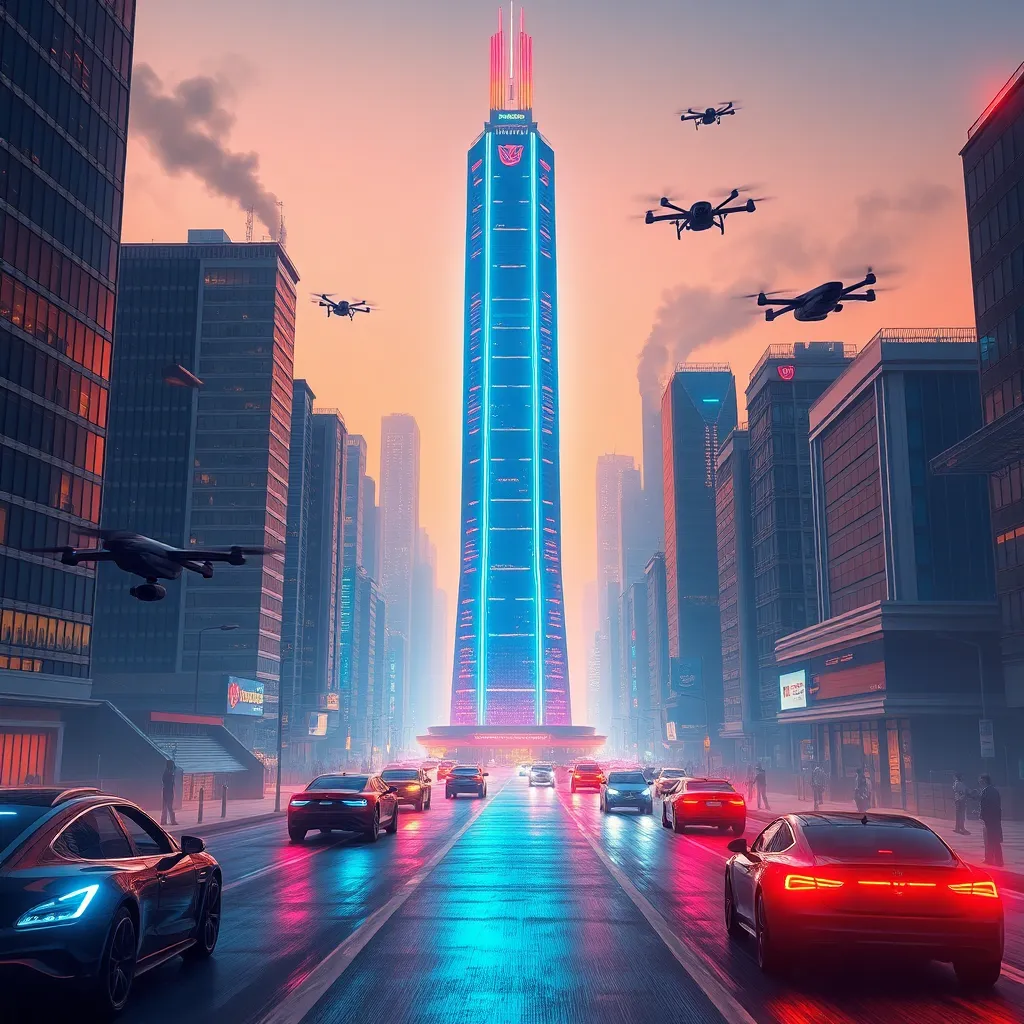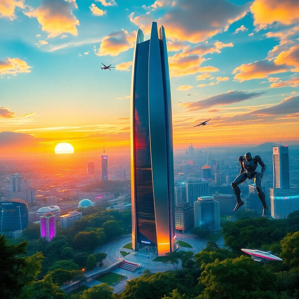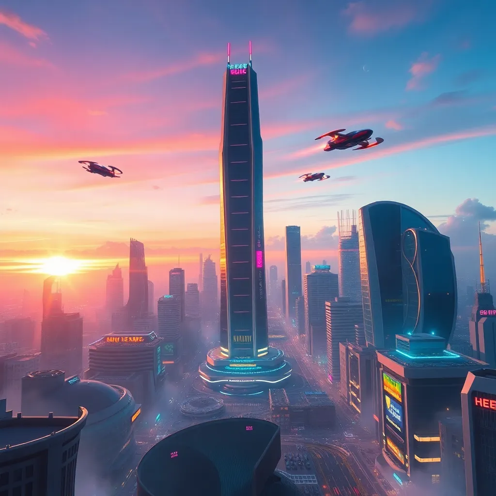 Create a futuristic cityscape at sunset with a prominent skyscraper in the center, surrounded by sleek, curved buildings and bustling streets. Incorporate vibrant colors, neon lights, and subtle smoke effects. Add a few flying cars and robots moving through the air, giving the scene a sense of dynamic energy.