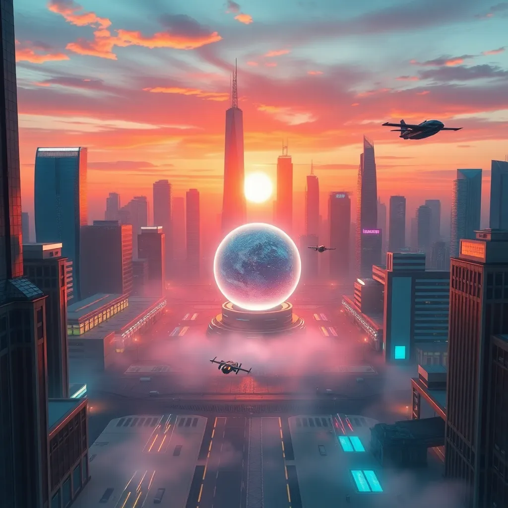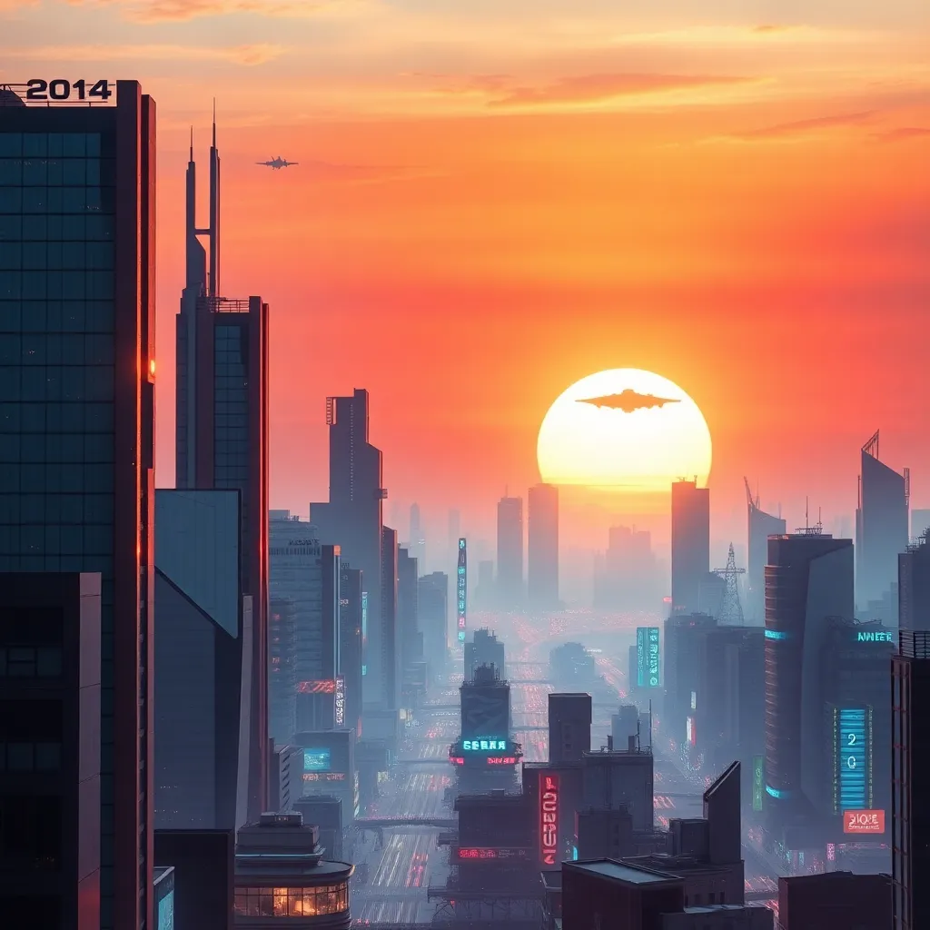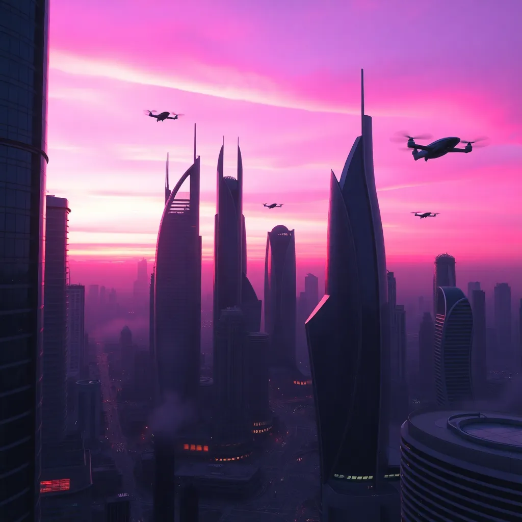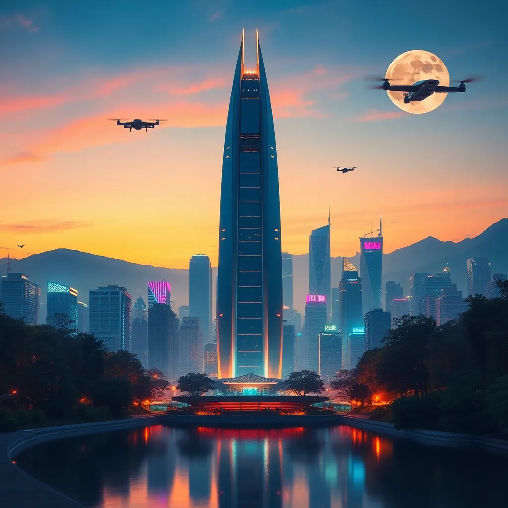 Create a futuristic cityscape at sunset with a prominent skyscraper in the center, surrounded by sleek, curved buildings and bustling streets. Incorporate vibrant colors, neon lights, and subtle smoke effects. Add a few flying cars and robots moving through the air, giving the scene a sense of dynamic energy.