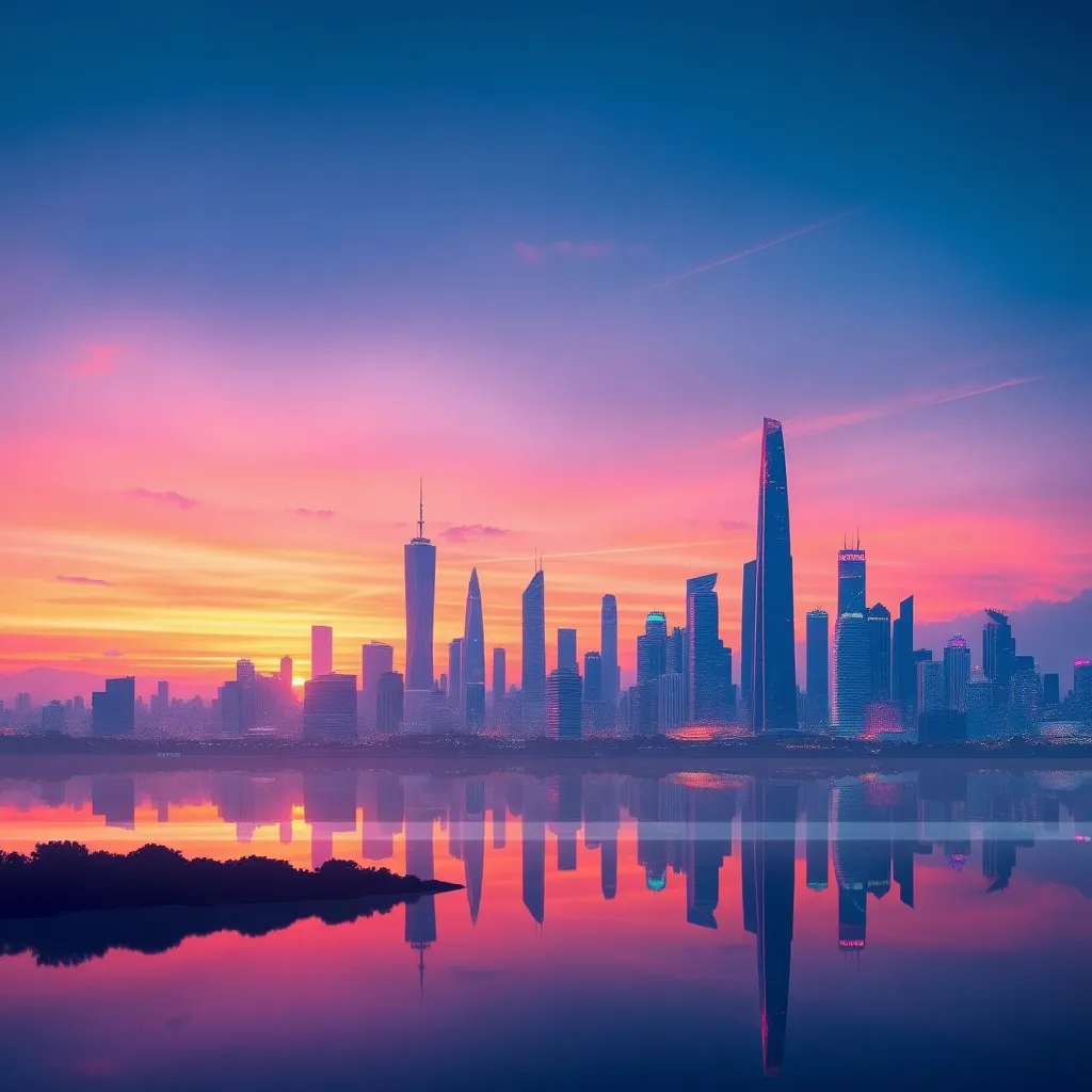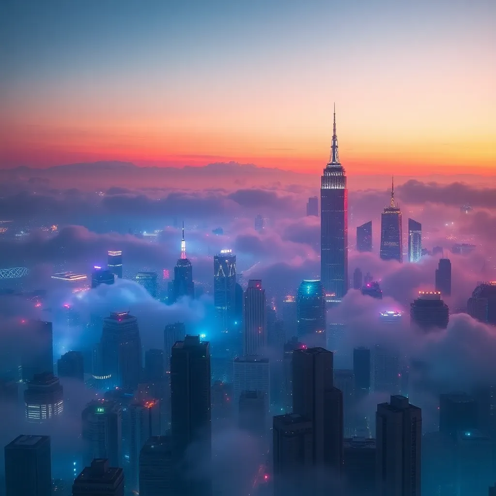 Create an ethereal cityscape at dusk, with a sprawling metropolis shrouded in a mystical aura. Incorporate glowing neon lights, wispy clouds, and towering skyscrapers. The atmosphere should be mystical and futuristic, evoking a sense of wonder and curiosity. Use a vibrant color palette with pastel hues.