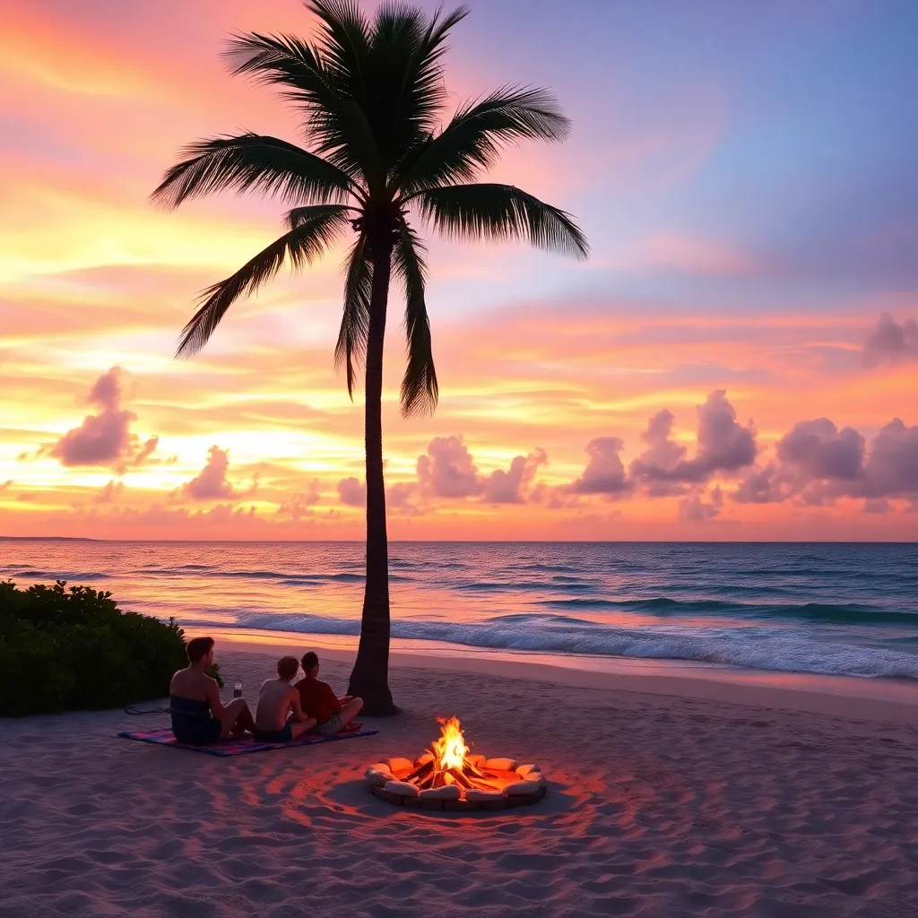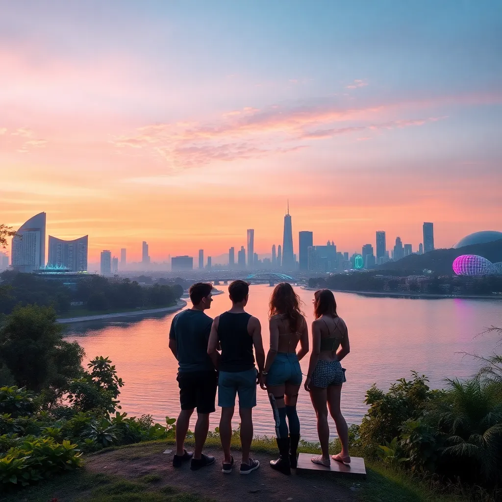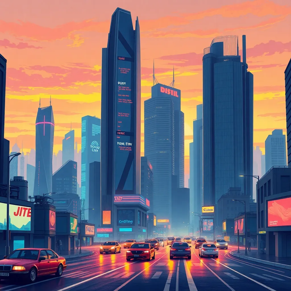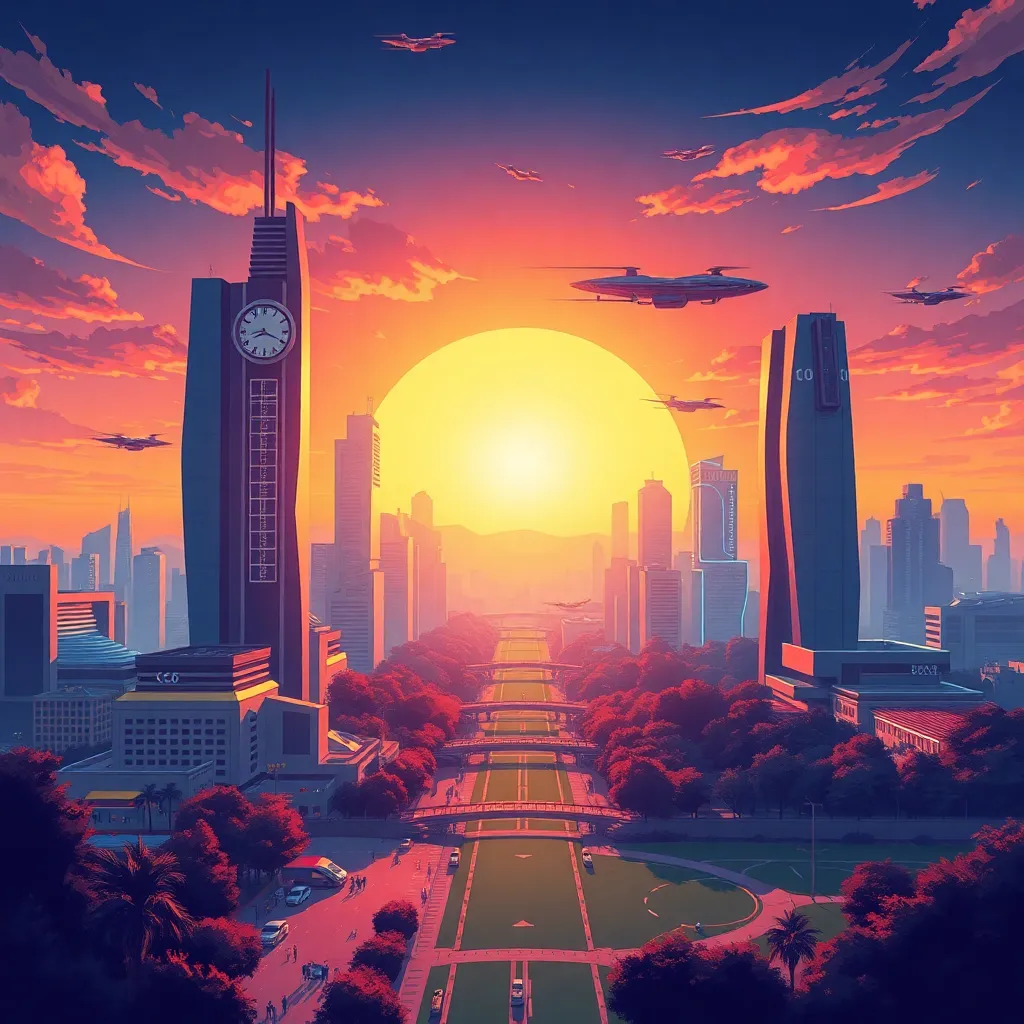 Create an illustration of a futuristic cityscape at sunset, with sleek skyscrapers, hovering cars, and a vibrant atmosphere. Incorporate a prominent clock tower, a sprawling park, and a subtle hint of neon lights. The color palette should be a mix of warm oranges, blues, and purples, with a sense of dynamic energy.