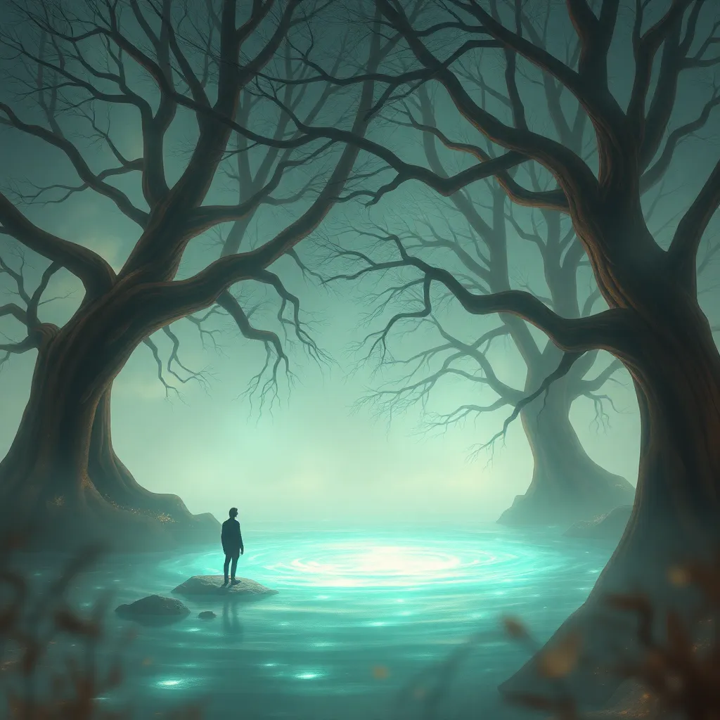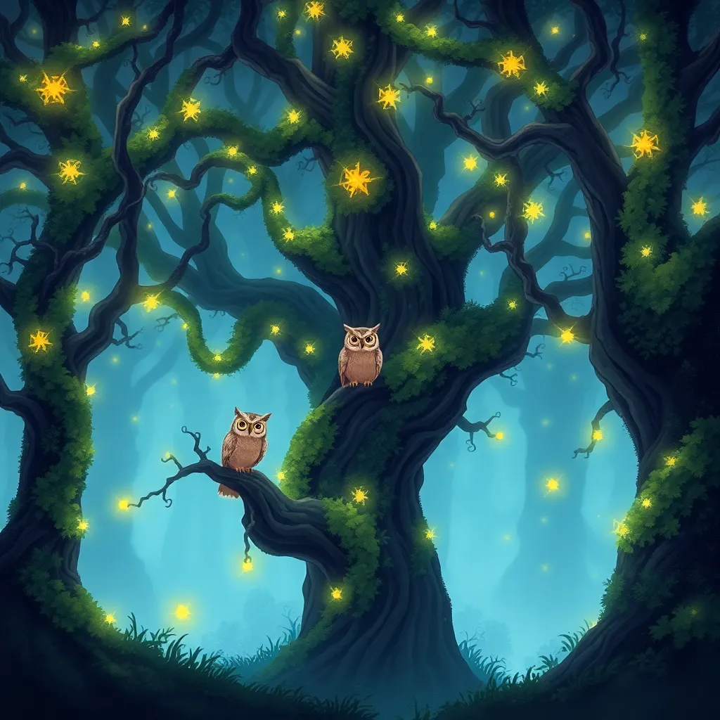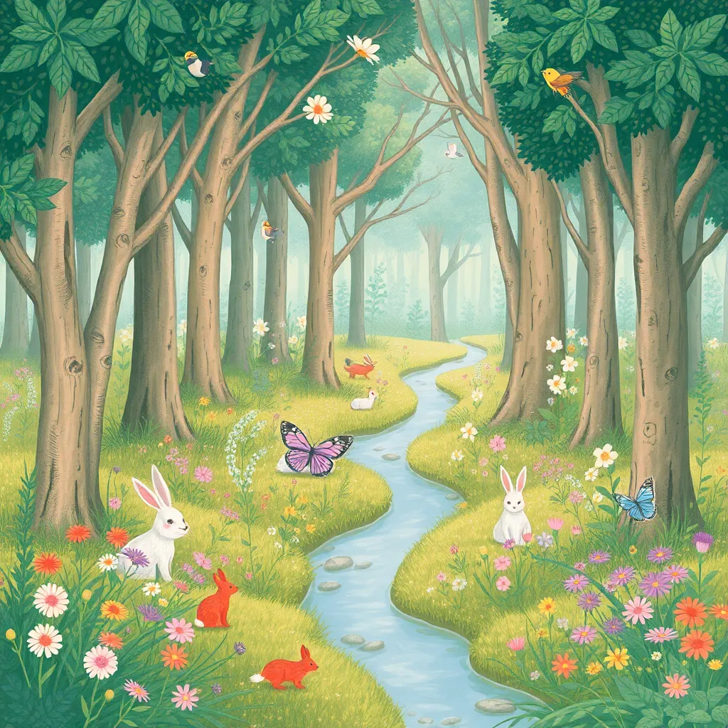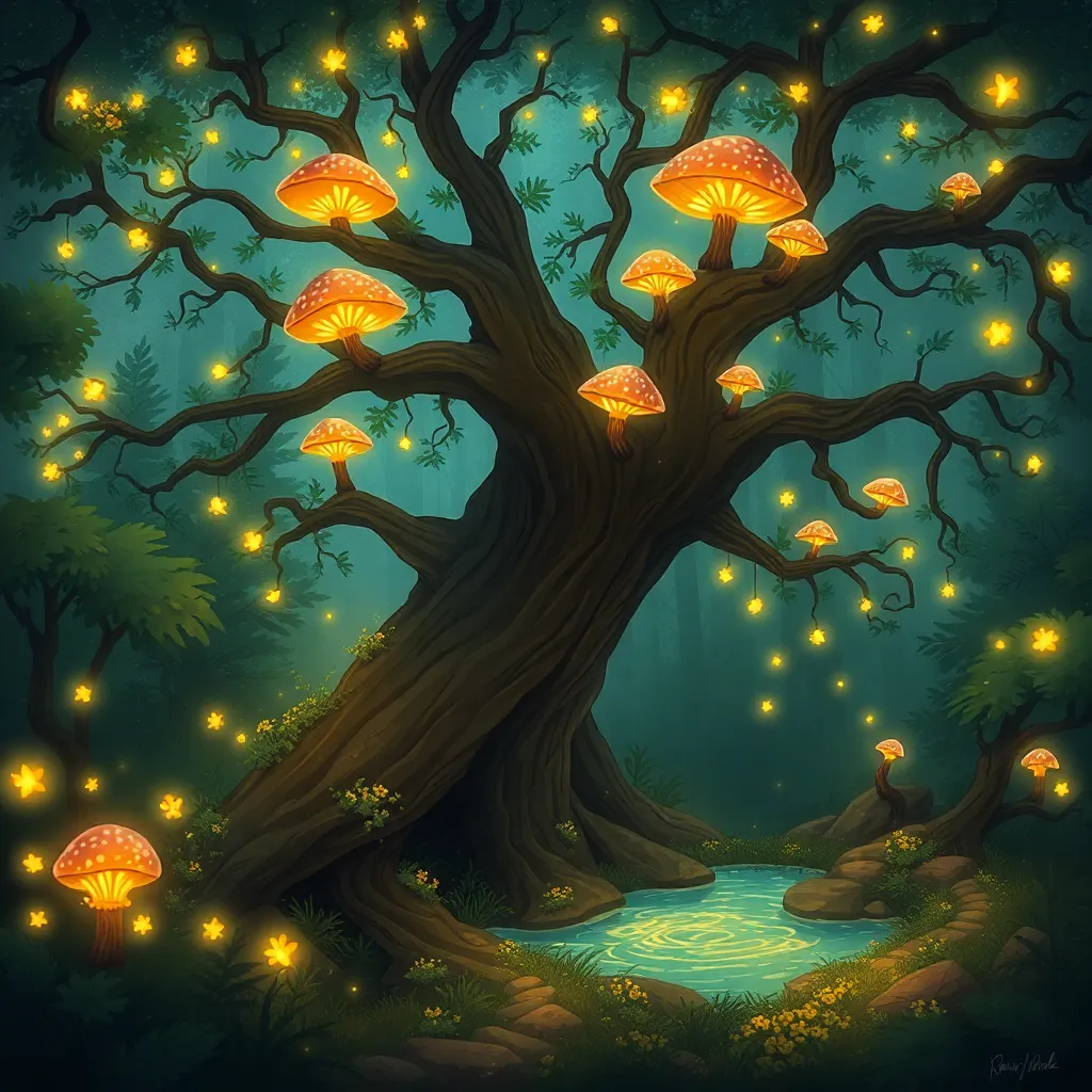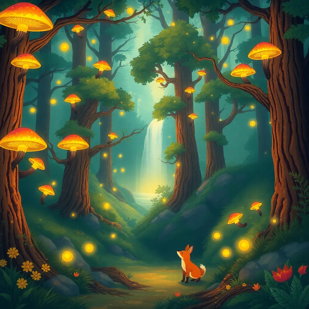 Create a vibrant, whimsical illustration of a fantastical forest, with towering trees adorned with glowing mushrooms, sparkling fireflies, and a misty waterfall in the distance. Incorporate a playful, curious creature (e.g. a fox or rabbit) exploring the forest floor, surrounded by lush foliage and soft, golden light.