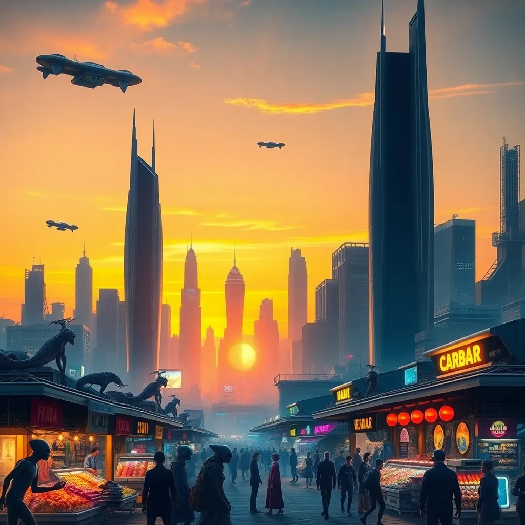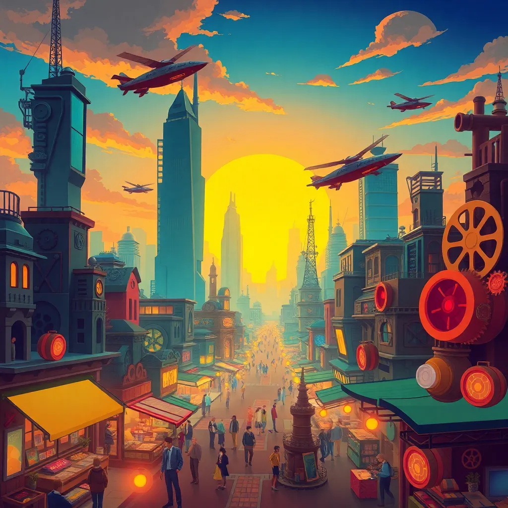 Create an illustration of a whimsical, futuristic cityscape at sunset, with towering skyscrapers and flying vehicles zipping by. Incorporate vibrant, neon-lit streets and a bustling market scene. Add a dash of steampunk flair with gears, cogs, and intricate machinery visible throughout the city's architecture.