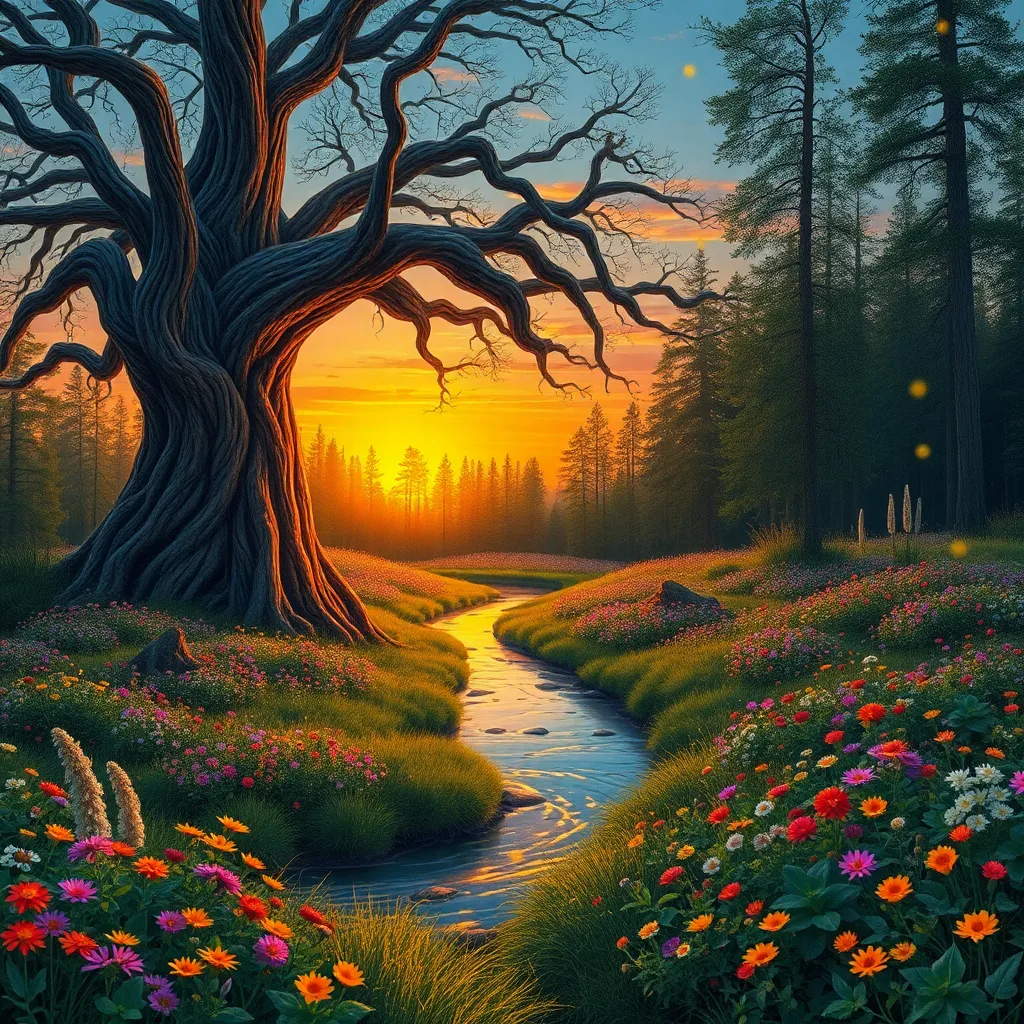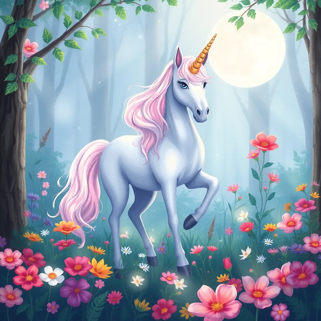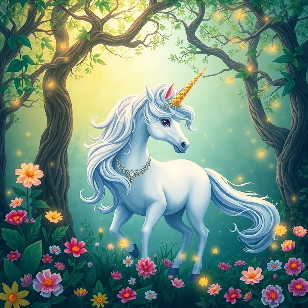 Create a whimsical illustration of a fantastical forest, featuring a majestic unicorn surrounded by lush greenery, vibrant flowers, and shimmering mist. Incorporate intricate tree branches, glowing fireflies, and a subtle moonlit glow. The unicorn should be adorned with glittering jewelry and a flowing mane.