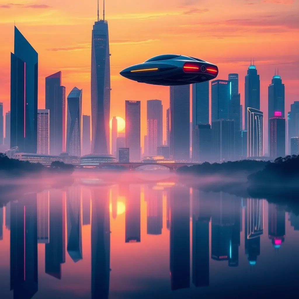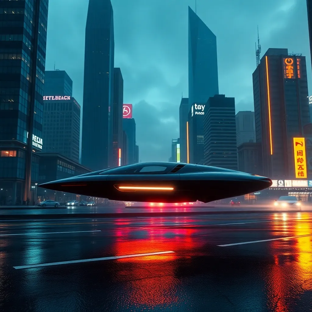 Create a futuristic cityscape at dusk, with towering skyscrapers and neon lights reflecting off the wet pavement. Incorporate a sleek, high-tech flying car hovering above the city, with a faint glow emanating from its body. The atmosphere should be moody and atmospheric, with a hint of mystery and adventure.