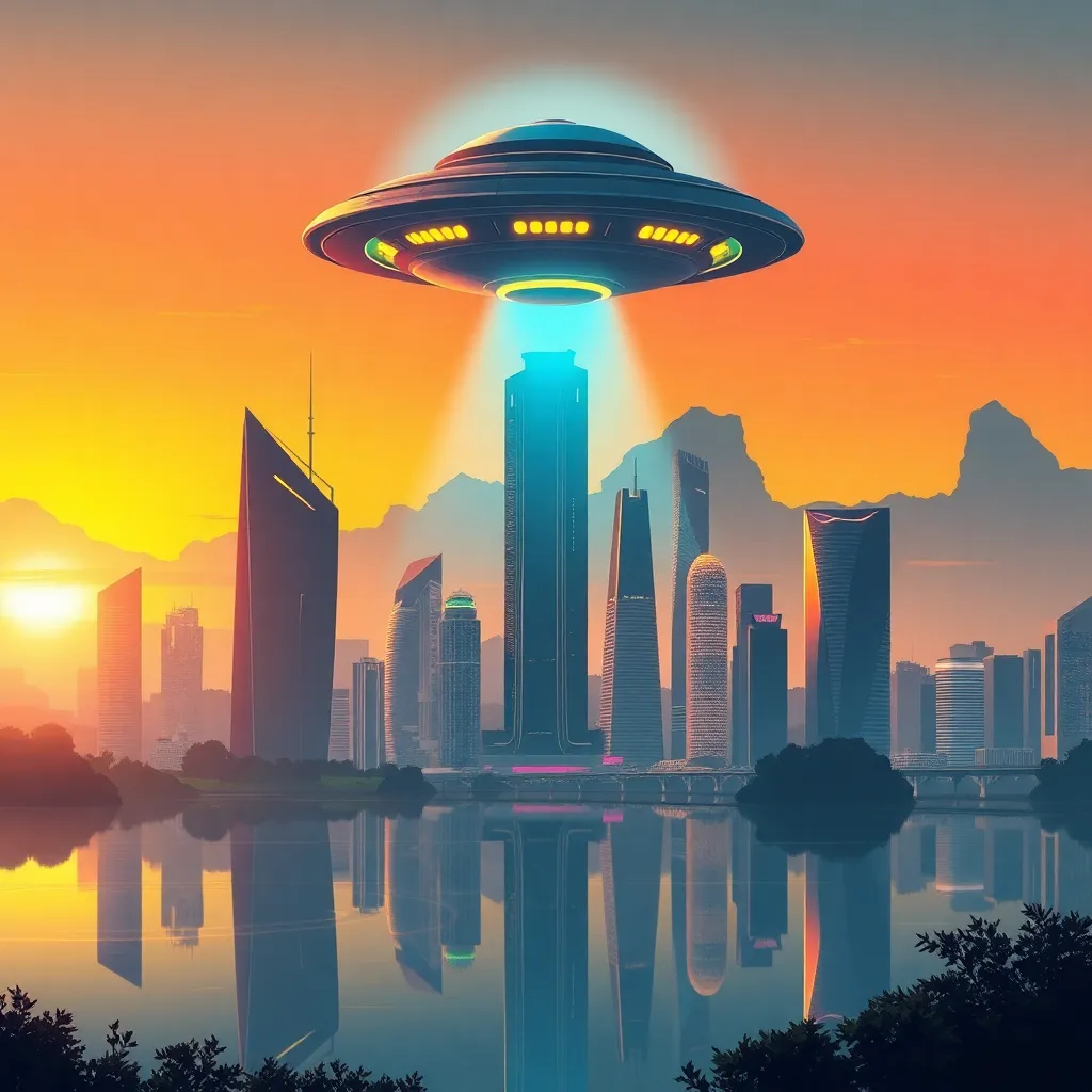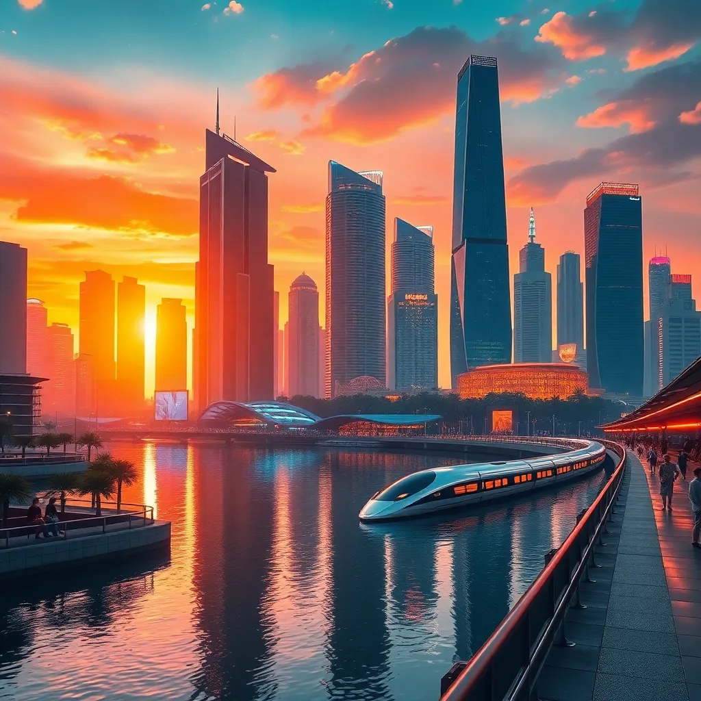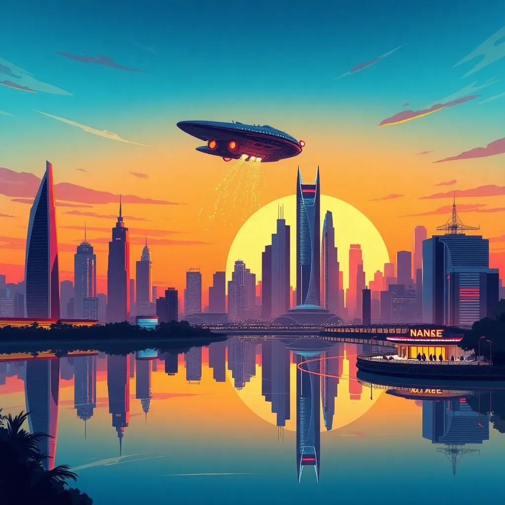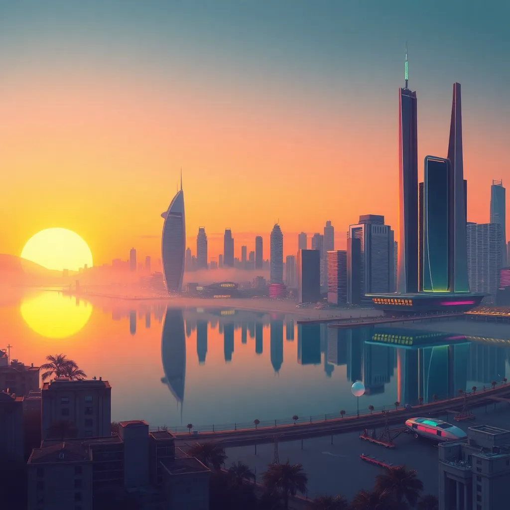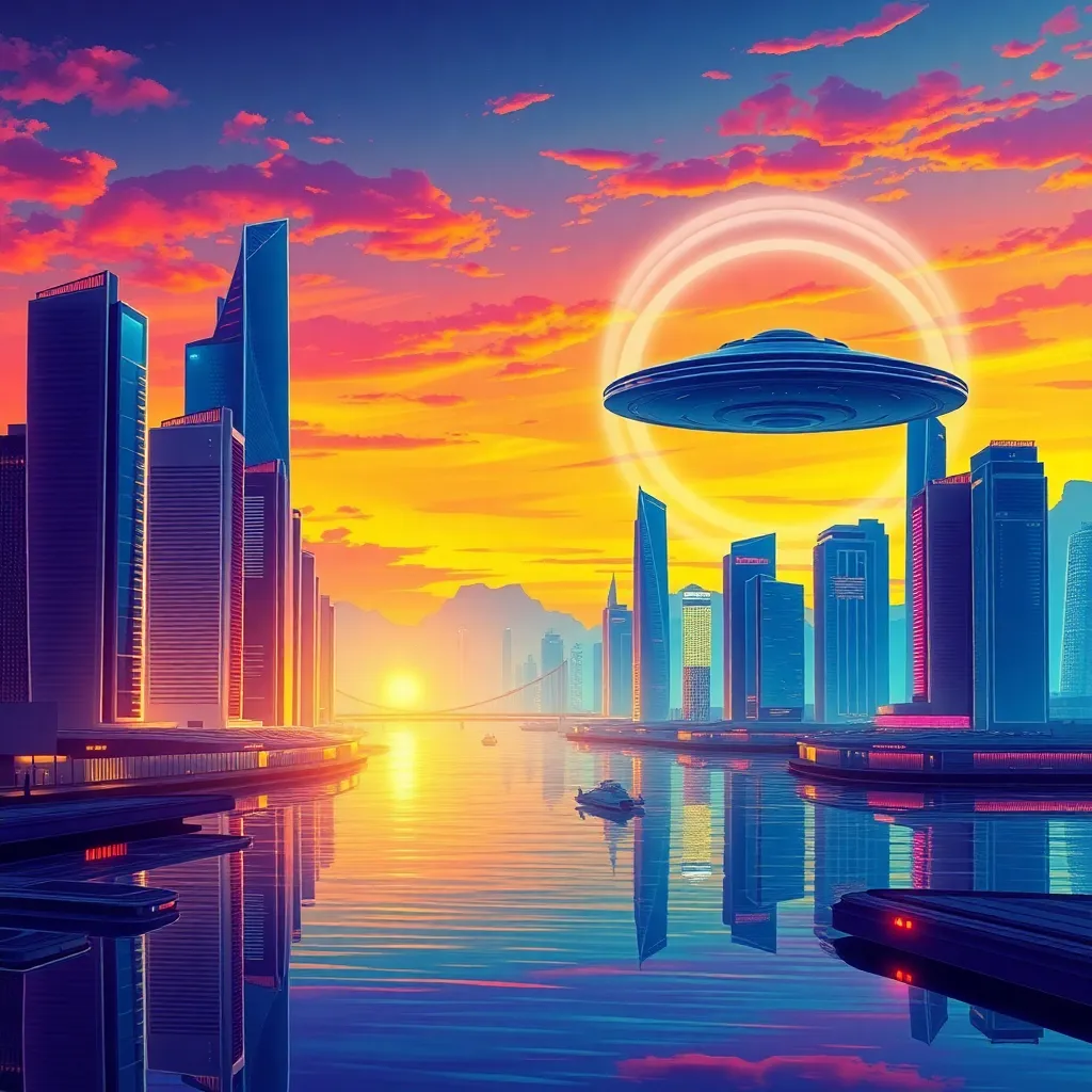 Create an illustration of a futuristic cityscape at sunset, with sleek skyscrapers and neon lights reflecting off a serene lake. Incorporate a majestic spaceship landing in the distance, with a trail of sparks and smoke leading to a bustling spaceport. Use vibrant colors and bold lines to bring the scene to life.