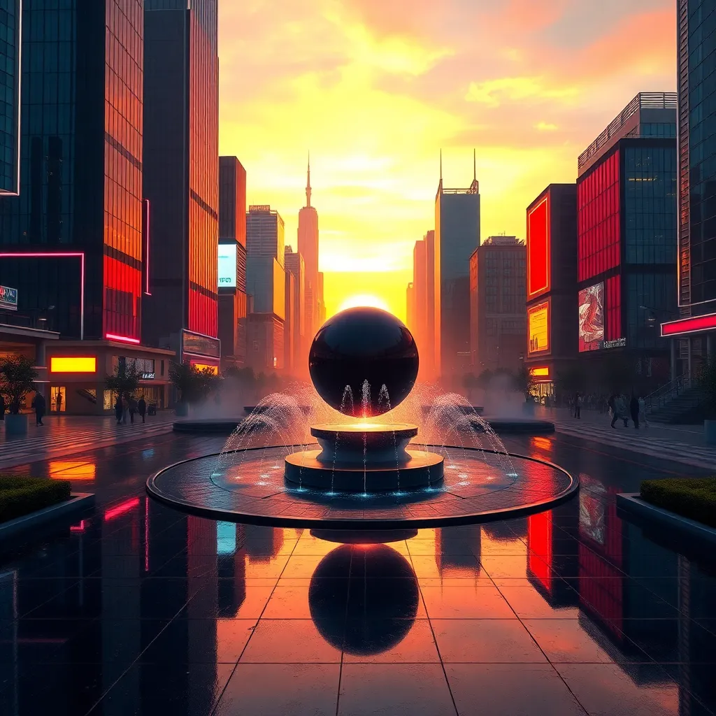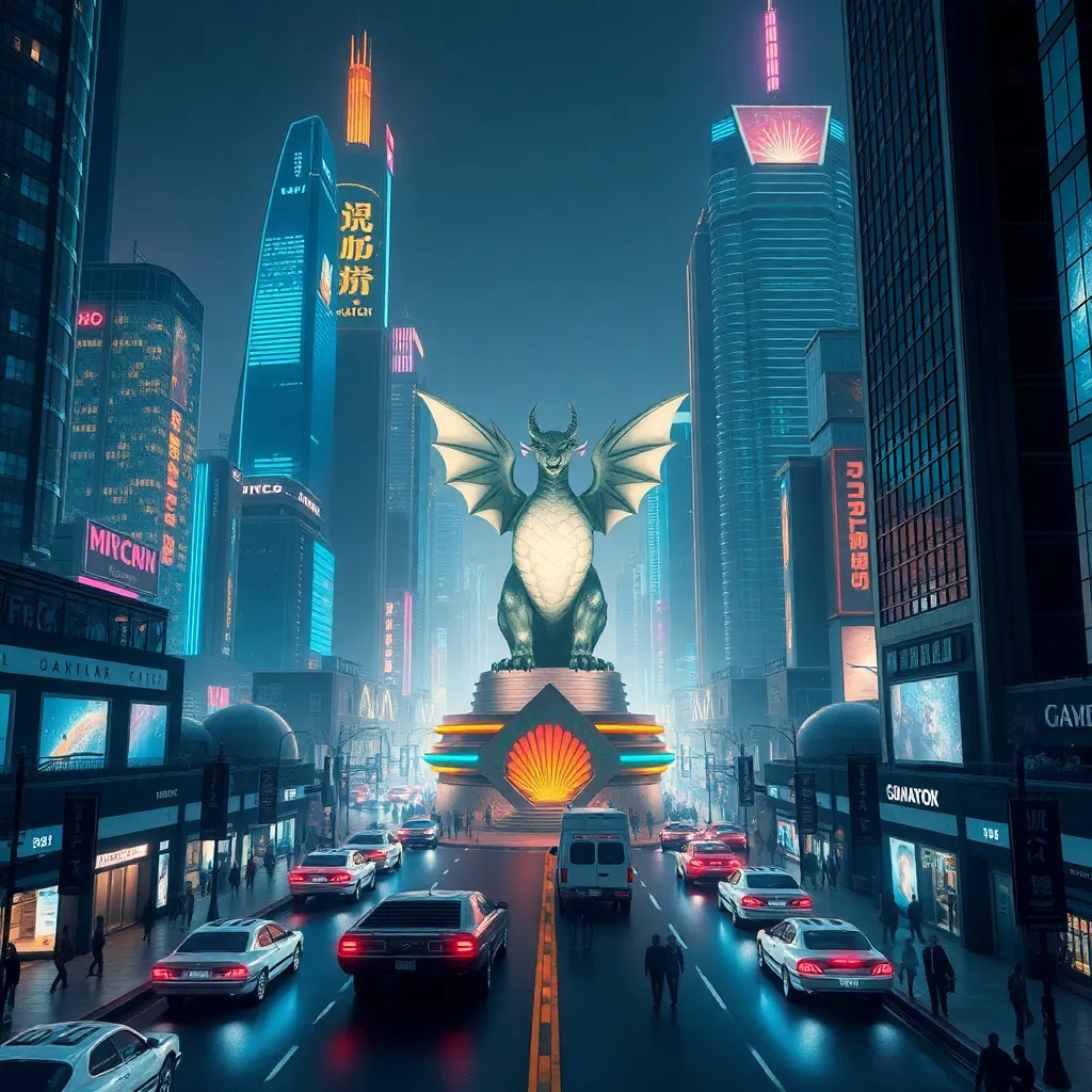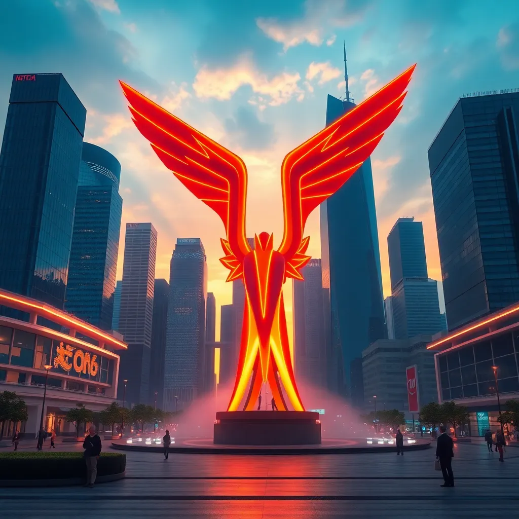 Create a futuristic cityscape at sunset, with sleek skyscrapers and a vibrant atmosphere. Incorporate a prominent public art installation in the foreground, featuring a bold, neon-lit sculpture of a winged creature. Use a palette of deep blues and oranges to capture the warm glow of the setting sun.