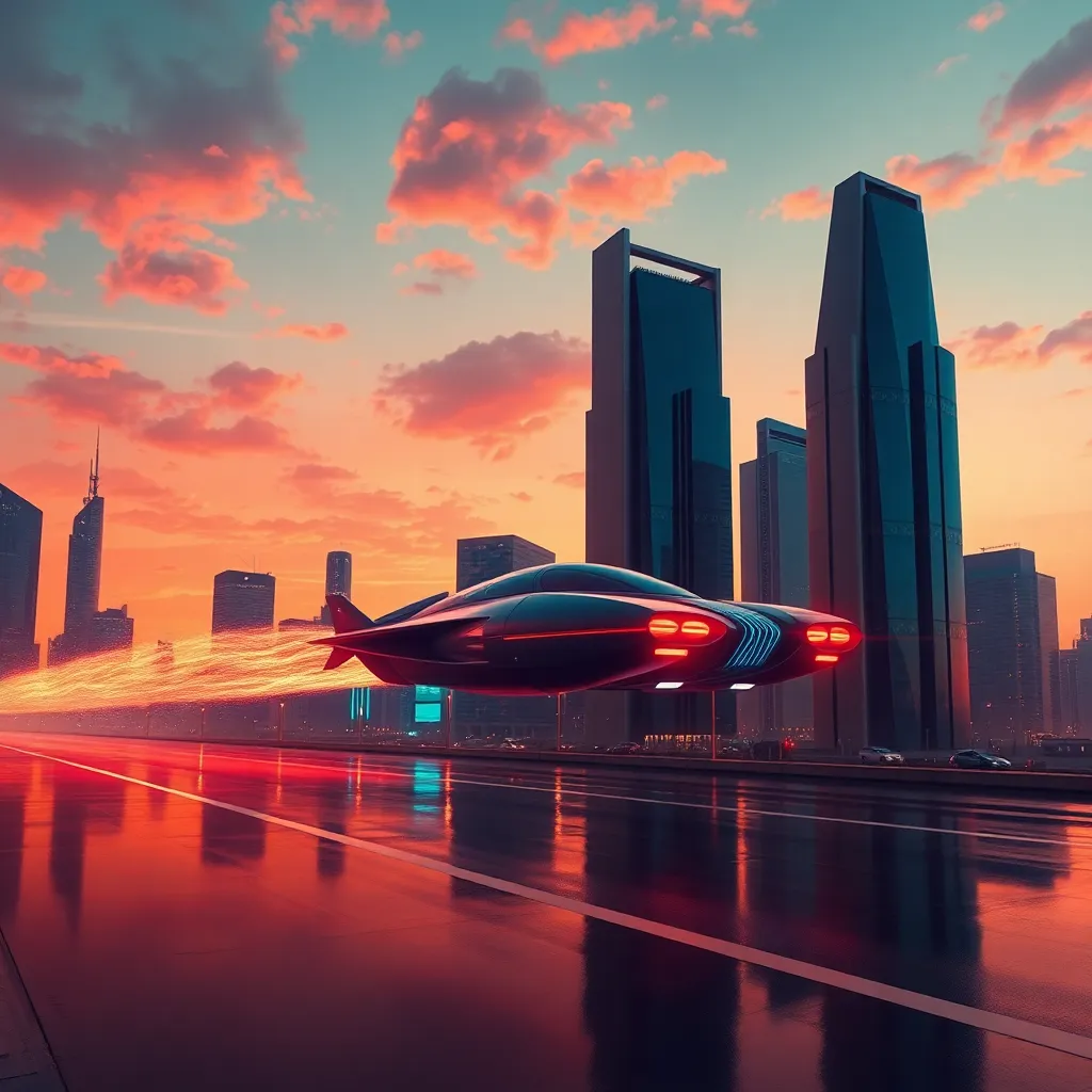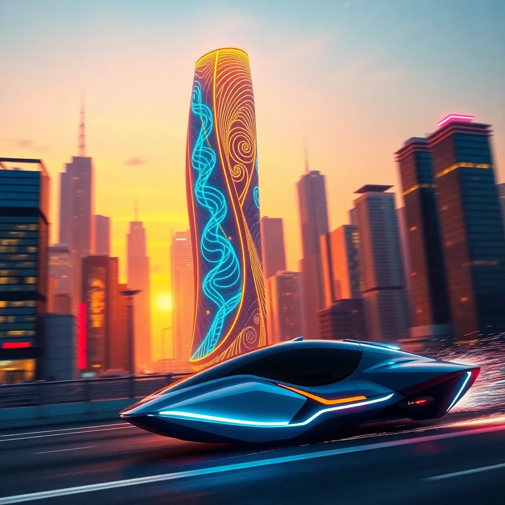 Create a futuristic cityscape at sunset with a bold, neon-lit skyscraper in the center. The building's facade is a mesmerizing pattern of swirling curves and geometric shapes. In the foreground, a sleek, high-tech hovercar speeds by, leaving a trail of shimmering sparks. Incorporate vibrant colors and dynamic lighting.