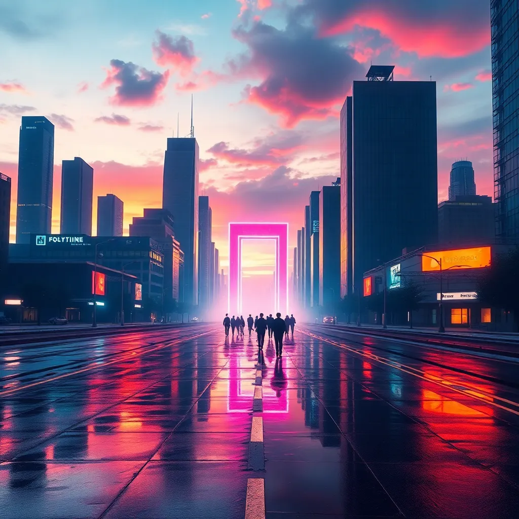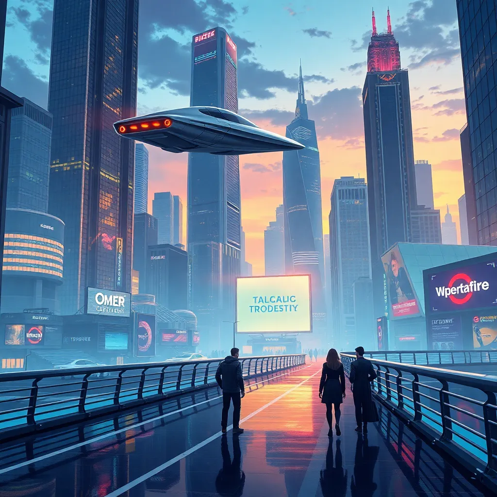 Create an illustration of a futuristic cityscape at dusk, with towering skyscrapers and neon lights reflecting off the wet pavement. Incorporate a sleek, silver flying car hovering above the rooftops, and a group of people in futuristic attire walking towards a glowing, holographic advertisement in the distance.
