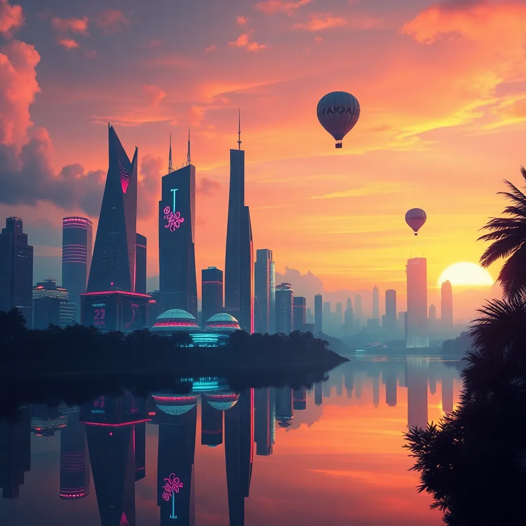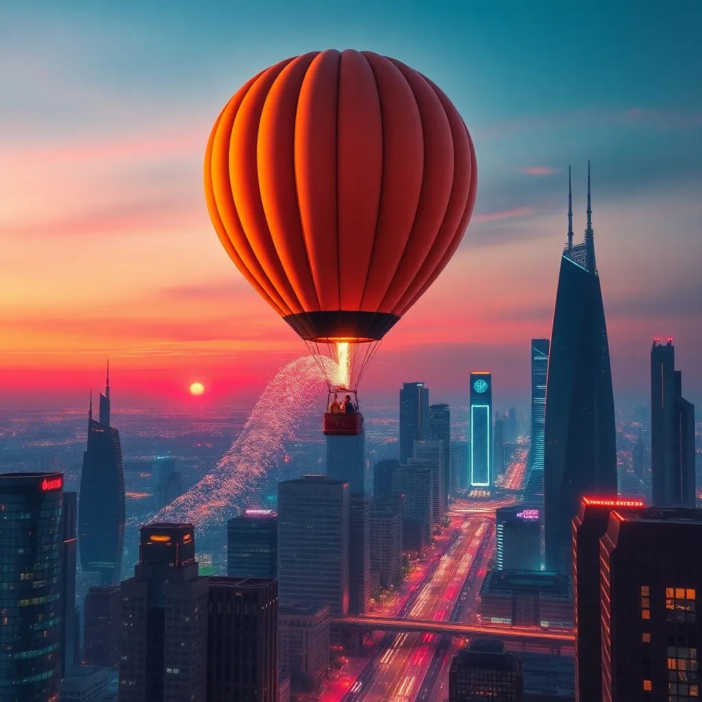 Create an image of a futuristic cityscape at sunset, with sleek skyscrapers and neon-lit streets. Incorporate a vintage-style hot air balloon hovering above the city, releasing a trail of colorful sparks into the sky. The atmosphere should be vibrant and energetic, with a sense of excitement and adventure.