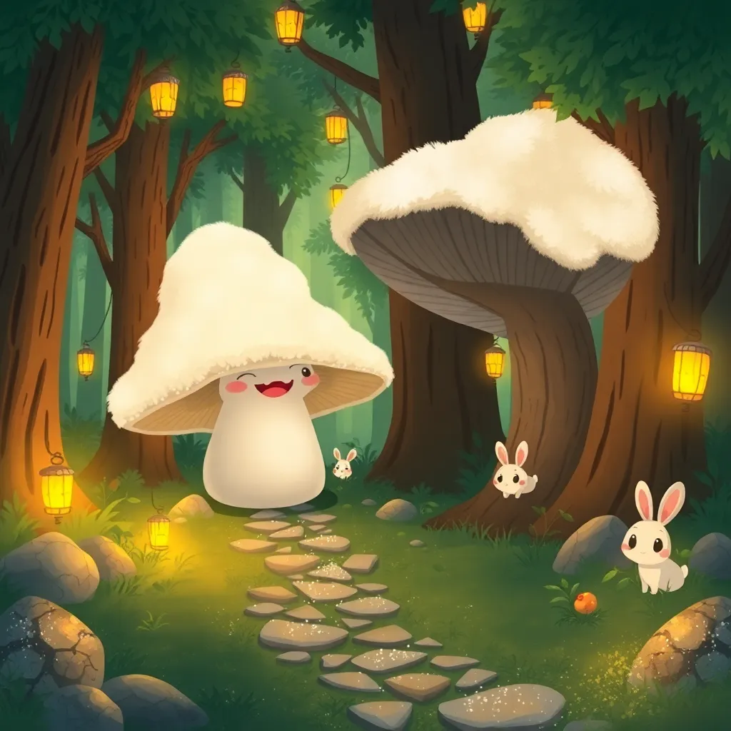 Create an illustration of a whimsical forest, featuring a giant, smiling mushroom with a fluffy white cap, surrounded by towering trees with glowing lanterns, a winding path made of sparkling stones, and a few curious, rabbit-like creatures peeking out from behind the foliage, all bathed in a warm, golden light.